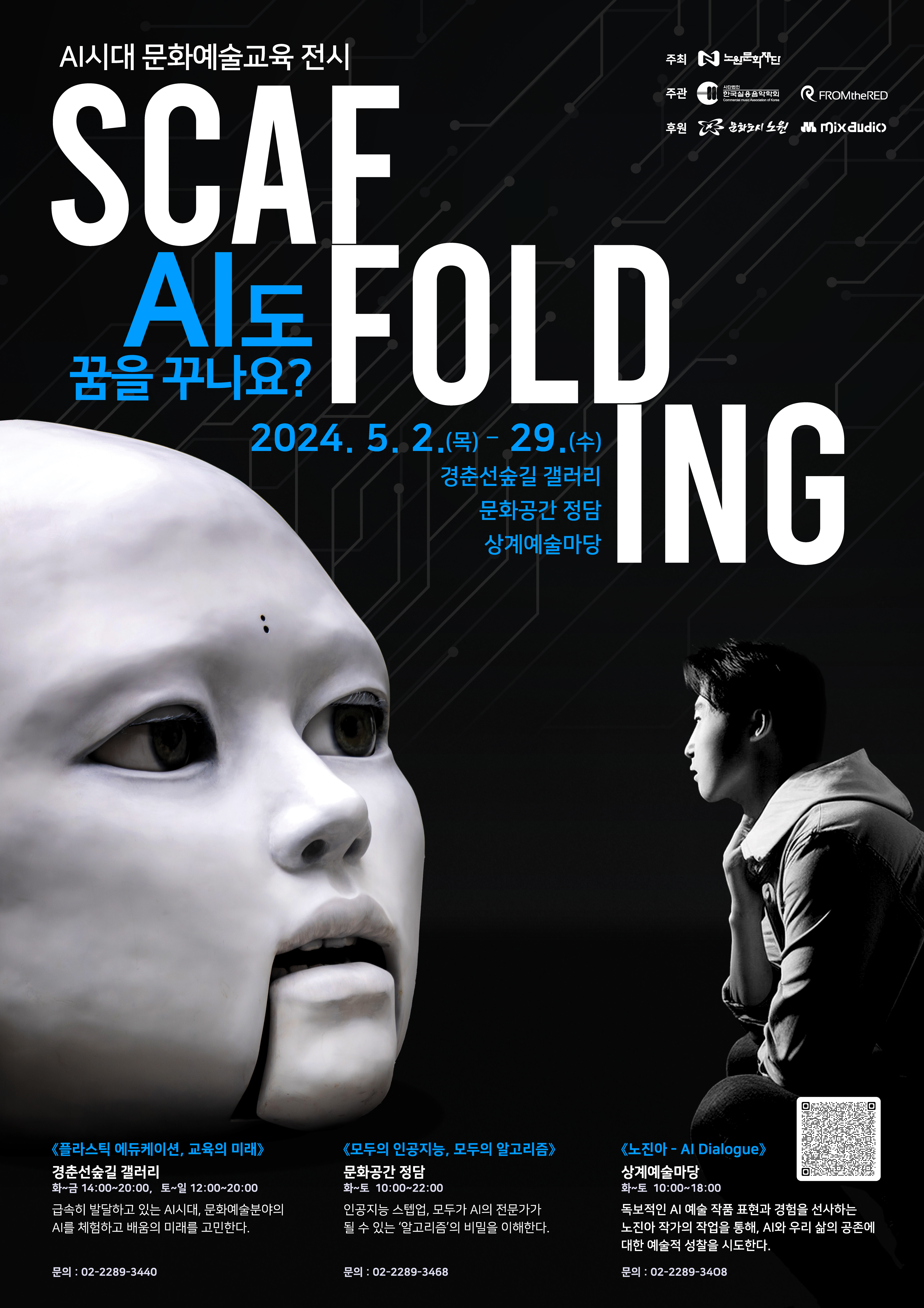 이러한 관점에서 AI시대 문화예술교육 전시 《스캐폴딩 Scaffolding》은 노원구에 위치한 3개의 공간(경춘선숲길 갤러리, 문화공간 정담, 상계예술마당)에 각기 다른 테마로 기획되어, 시민들과 AI시대의 변화를 함께 고민하는 자리가 될 것이다.