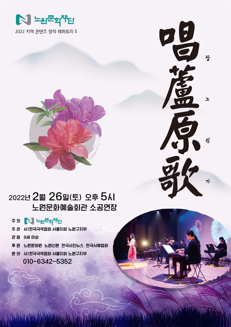 [퍼스트신문] 노원문화재단 2022 지역 콘텐츠 창작 레퍼토리 창노원가 -지역의 자원을 발굴하는 창작 레퍼토리 시리즈 제작-첫 번째 무대, 노원의 역사와 아름다움을 노래하다노원문화재단(이사장 김승국)은 2월 26일(토) ‘2022 지역 콘텐츠 창작 레퍼토리’ 시리즈의 첫 번째로 ‘창노원가唱蘆原歌’를 공연한다.지역 콘텐츠 창작 레퍼토리는 노원구의 문화와 역사 자원을 소재로 삼아 콘텐츠화하는 작품개발 사업으로, 지역의 인적 자원인 공연예술단체와 협업하여 창작활동을 연계시켜 작품을 제작한다. 이번 ‘창노원가唱蘆原歌’ 프로젝트는 노원국악협회와 협업하여 무대에 올린다. 또한 국악협회원들뿐 아니라 전통과 국악의 가치를 보존 전승해나가는 노원의 국악 예술인들이 함께 무대에 서서 신명 나고 즐거운 국악 한마당을 선사할 예정이다.전문: 퍼스트신문(http://55.1stn.kr/bbs/board.php?bo_table=board1_3&wr_id=324)