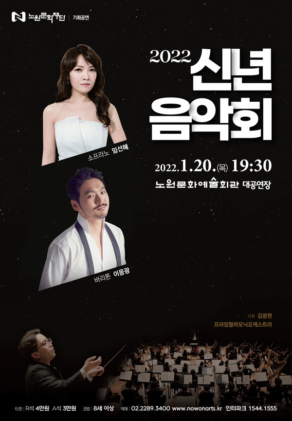 [월드스타]노원문화재단, 새해 첫 공연 '2022 신년음악회' 개최2022년 신년음악회'는 코로나19 장기화 상황에서도 각자 자리에서 일상회복을 위해 애쓰는 구민의 마음을 위로하고자 세계무대에서 활동하는 대한민국 대표 성악가인 소프라노 임선혜와 바리톤 이응광이 희망과 새 출발을 기원하며 노래한다. 맑고 빛나는 소리와 다채로운 연기력으로 오페라와 뮤지컬 등 장르를 오가며 활약하는 소프라노 임선혜와 스위스의 보석으로 불리며 특유의 서정성과 섬세함으로 스위스 바젤 오페라 하우스 전속 주역으로 활동한 바리톤 이응광, 유럽 무대에서 활동하는 두 성악가를 한 무대에서 만난다는 것만으로도 큰 기대를 모은다.