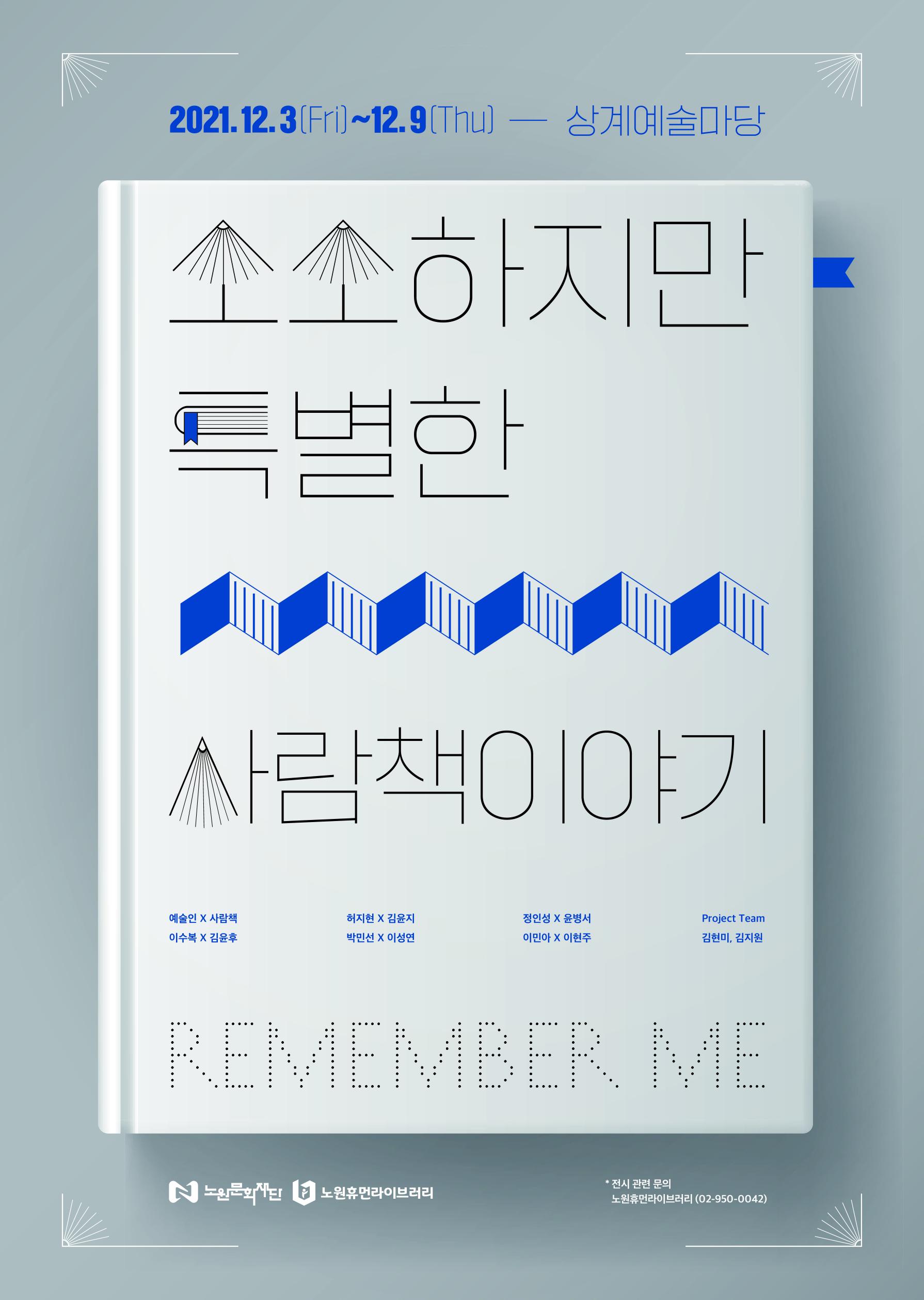 노원구 휴먼라이브러리 <소소하지만 특별한 사람책 이야기> 전시회 - 사람책 이야기, 노원지역 예술인과 주민의 커뮤니티 아트 예술작품 전시회 진행 - 12월 3일 ~ 9일, 7일간 상계예술마당에서 진행노원 휴먼라이브러리(임미경 관장)는 지난 3일 상계예술마당(상계로10길 41-7)에서 지역 내 공감의 가치를 실현하는 휴먼북들의 이야기를 담은 ‘소소하지만 특별한 사람책 이야기 전시회’를 개최했다.전문: 노원퍼스트신문(http://55.1stn.kr/bbs/board.php?bo_table=board1_3&wr_id=303)