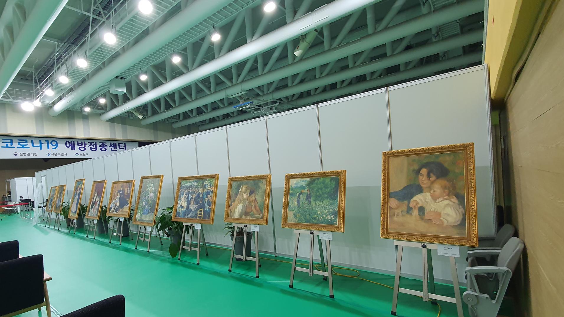 노원구 백신접종센터에 예술작품 전시…'마음 방역' 나선다|월계구민체육센터 접종 후 회복실에 예술백신갤러리|르누아르·모네·반 고흐 등 다양한 작품 전시회서울 노원구(구청장 오승록)는 백신접종센터에 '예술백신갤러리'를 조성하고 전시회를 열어 구민들을 위한 마음 방역에 나선다고 24일 밝혔다. 접종센터 회복실에 마련된 예술백신갤러리에는 유명한 명화가 전시 된다. 전시되는 작품은 특수 제작된 레플리카로 걸작들의 붓 터치와 색감을 생생하게 재현했다.전문: 뉴스1(https://www.news1.kr/articles/?4412055)