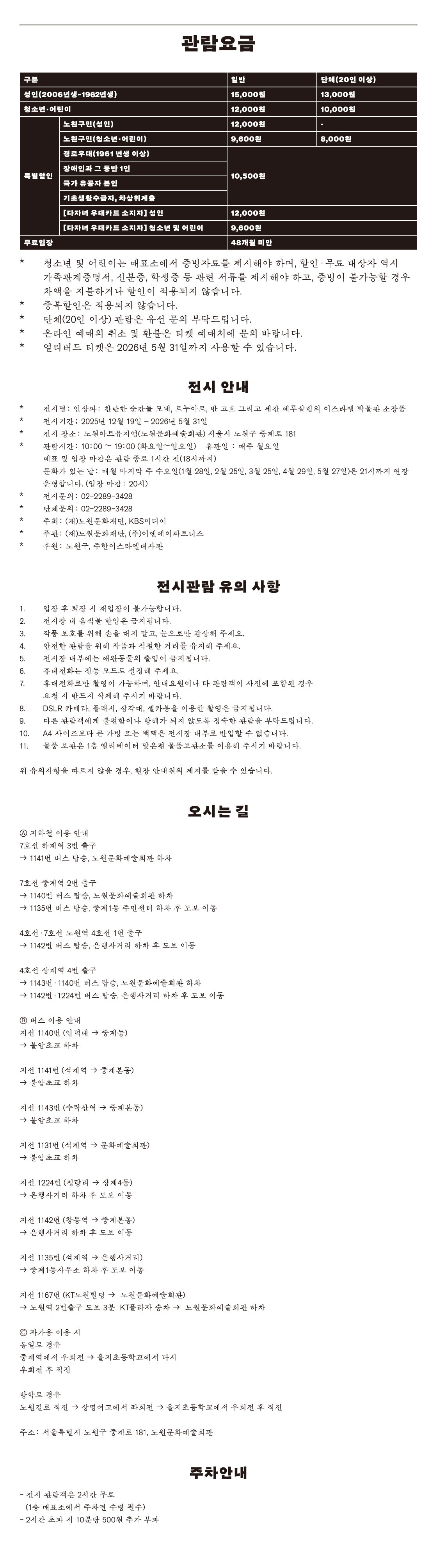 - 운영시간 : 화~일요일 10:00~19:00 / 입장마감 : 18:00 *매주 월요일 및 신정(1.1), 설 당일(2.17) 휴관