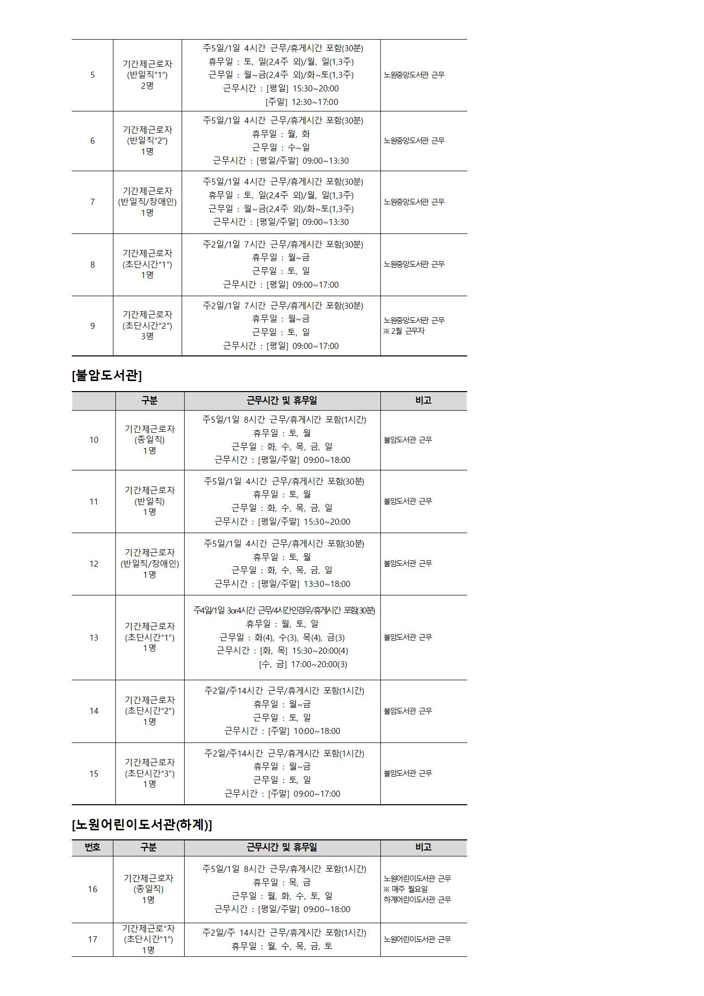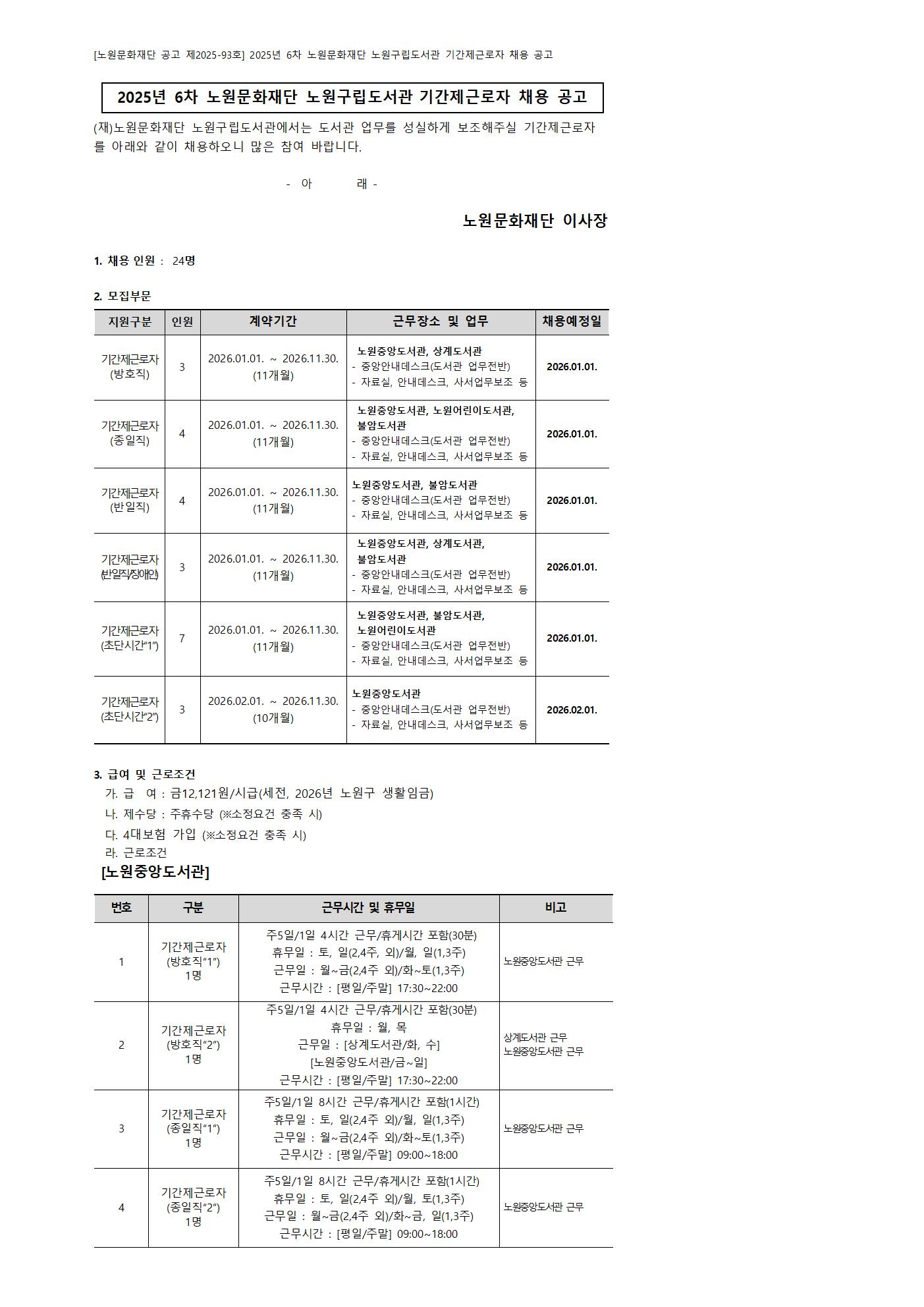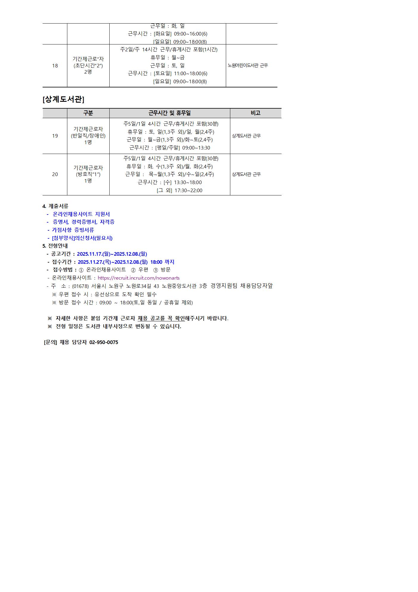 채용공고 2025년 6차 노원문화재단 노원구립도서관 기간제근로자 채용 공고(노원중앙도서관, 불암도서관, 노원어린이도서관, 상계도서관) 2025.11.17 281 현재 URL 복사 블로그 바로가기 온라인채용사이트 바로가기 첨부파일 #1: 2025년 6차 노원문화재단 노원구립도서관 기간제근로자 채용 공고.zip 이전글 2025년 5차 노원문화재단 노원구립도서관 기간제근로자 서류전형 결과 및 면접전형 공고(노원어린이도서관) 다음글 2025년 5차 노원문화재단 노원구립도서관 기간제근로자 재공고 채용 공고(장애인전형) 목록