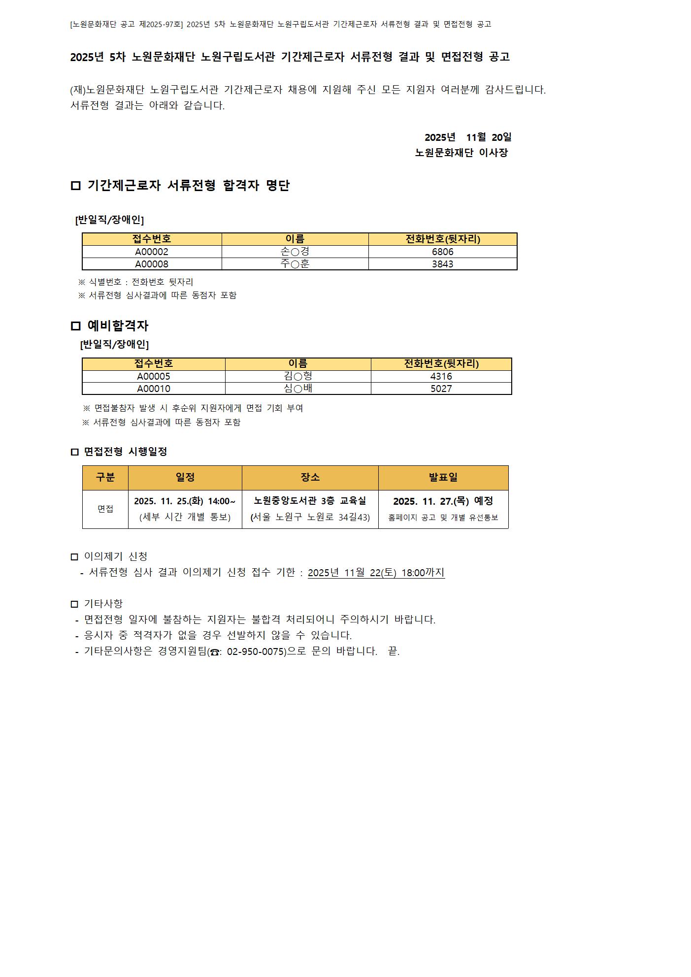 채용공고 2025년 5차 노원문화재단 노원구립도서관 기간제근로자 서류전형 결과 및 면접전형 공고(노원어린이도서관) 2025.11.20 53 현재 URL 복사 블로그 바로가기 첨부파일 #1: [붙임] 채용결과이의신청서.hwp 이전글 2025년 5차 노원문화재단 노원구립도서관 채용 공고[대체계약직-사서] 다음글 2025년 6차 노원문화재단 노원구립도서관 기간제근로자 채용 공고(노원중앙도서관, 불암도서관, 노원어린이도서관, 상계도서관) 목록