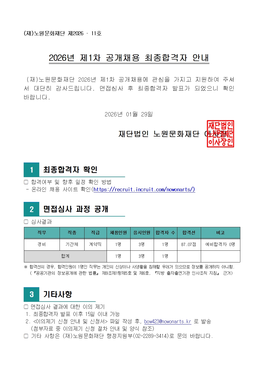 채용공고 2026년 제1차 공개채용 최종합격자 공고 2026.01.29 250 현재 URL 복사 블로그 바로가기 최종합격자 공고 바로가기 이전글 2026년 제2차 공개채용 서류심사 합격자 및 면접심사 안내 다음글 2026년 제1차 공개채용 서류심사 합격자 및 면접심사 안내 목록