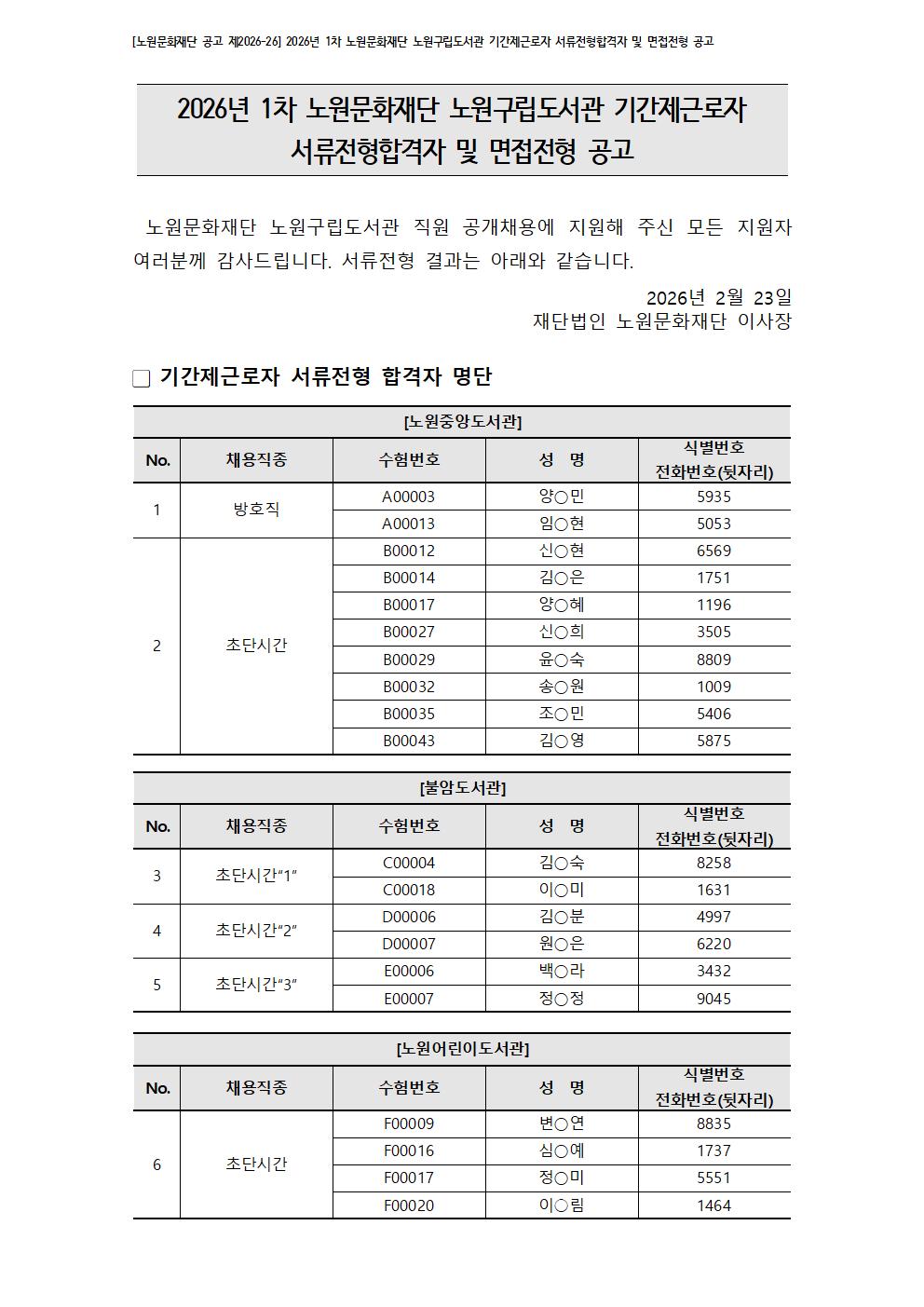 채용공고 2026년 1차 노원문화재단 노원구립도서관 기간제근로자 서류전형합격자 및 면접전형 공고 2026.02.23 149 현재 URL 복사 블로그 바로가기 첨부파일 #1: [붙임] 채용결과이의신청서.hwp 다음글 2026년 제2차 공개채용 최종합격자 공고 목록