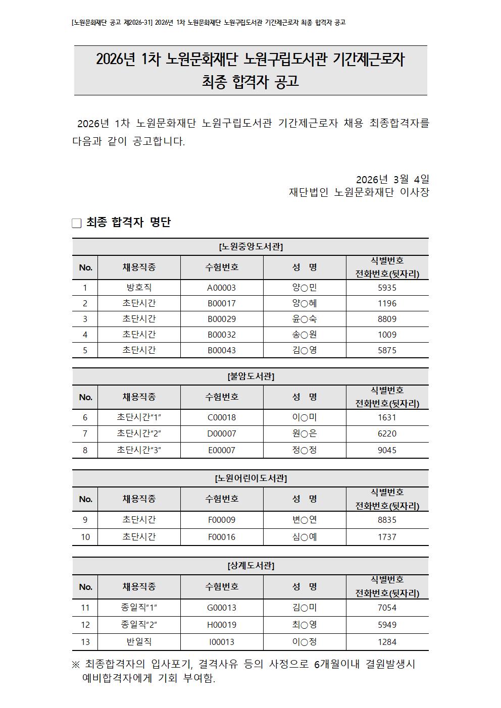 채용공고 2026년 1차 노원문화재단 노원구립도서관 기간제근로자 최종 합격자 공고 2026.03.04 141 현재 URL 복사 블로그 바로가기 첨부파일 #1: [붙임] 채용결과이의신청서.hwp 다음글 2026년 2차 노원문화재단 노원구립도서관 서류전형 합격자 및 면접전형 공고[대체계약직-사서] 목록