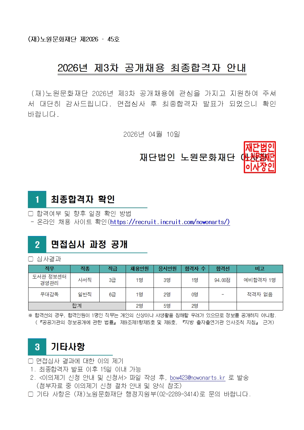 채용공고 2026년 제3차 공개채용 최종합격자 공고 2026.04.10 46 현재 URL 복사 블로그 바로가기 다음글 2026년 제3차 공개채용 서류심사 합격자 및 면접심사 안내 목록