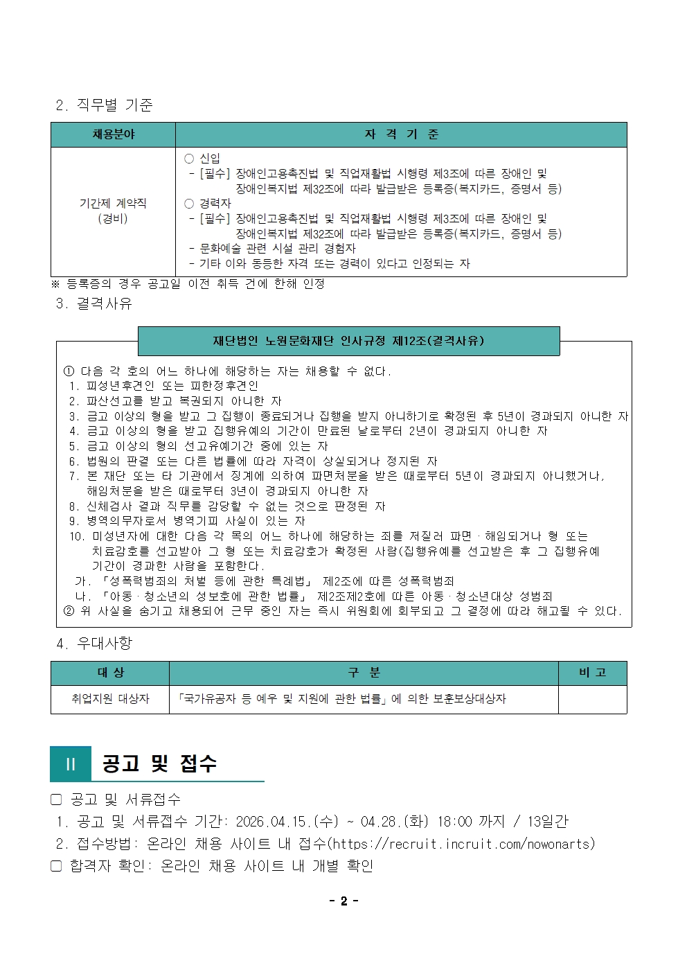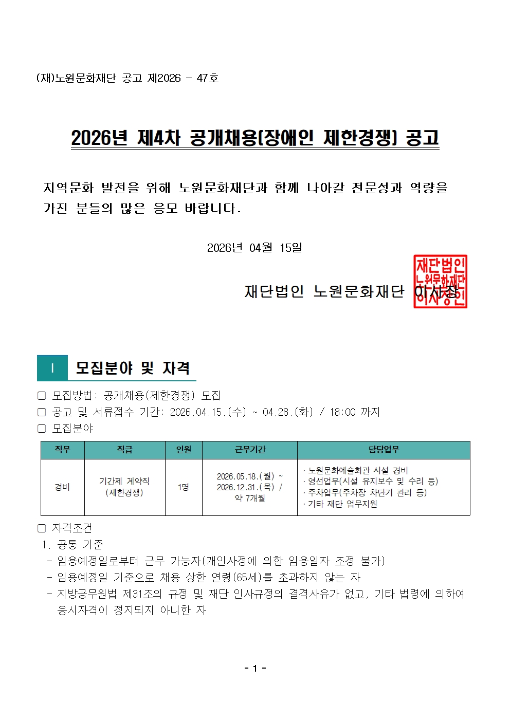 채용공고 2026년 제4차 공개채용 공고(제한경쟁) 2026.04.15 451 현재 URL 복사 블로그 바로가기 ○ 2026년 제4차 공개채용 공고 바로가기 ○ 첨부파일 #1: 이의제기 신청 안내 및 신청서.hwp 이전글 2026년 3차 노원문화재단 노원구립도서관 정규직(사서,행정) 서류전형합격자 및 면접공고 다음글 2026년 제3차 공개채용 재공고 목록