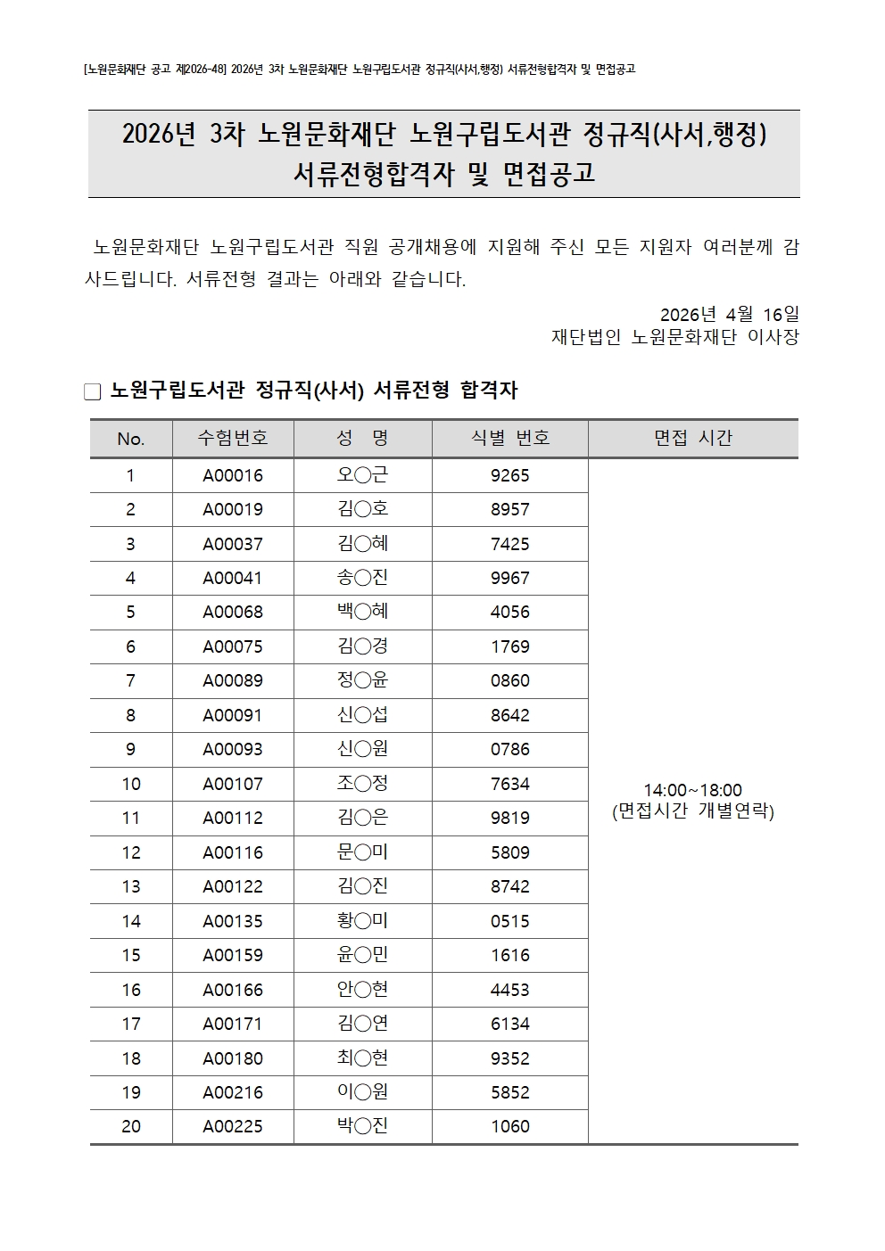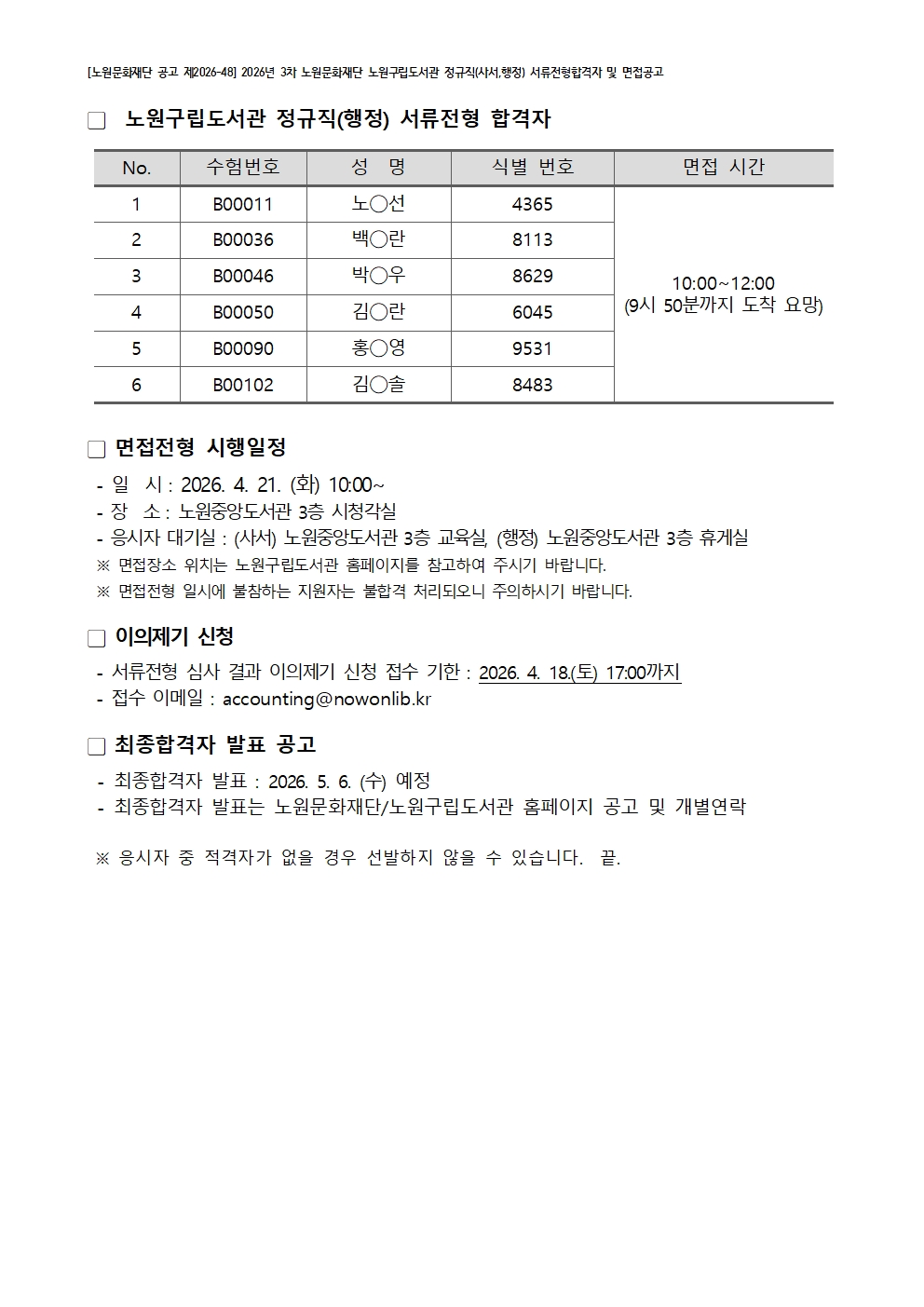 채용공고 2026년 3차 노원문화재단 노원구립도서관 정규직(사서,행정) 서류전형합격자 및 면접공고 2026.04.16 423 현재 URL 복사 블로그 바로가기 첨부파일 #1: 채용결과 이의신청서.hwp 다음글 2026년 제4차 공개채용 공고(제한경쟁) 목록