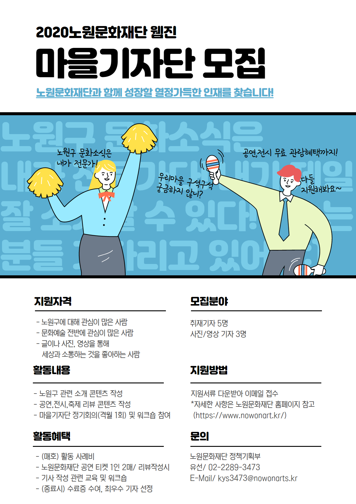 노원문화재단에서 2020년 새롭게 발행될 노원문화재단 웹진의 마을기자단을 모집합니다.