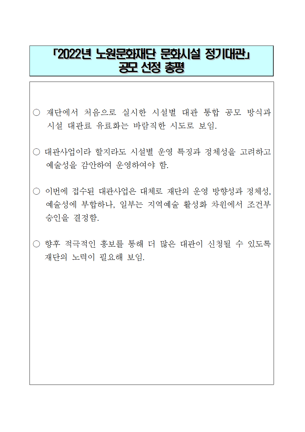 공지사항 2022년 노원문화재단 문화시설 정기대관 최종 선정 결과 발표 2022.01.12 46,001 현재 URL 복사 블로그 바로가기 첨부파일 #1: 공모선정 심사총평.png 이전글 2022 노원문화재단 사업설명회 연기 안내 다음글 (재)노원문화재단 노원어린이극장 예술감독 공개모집 목록