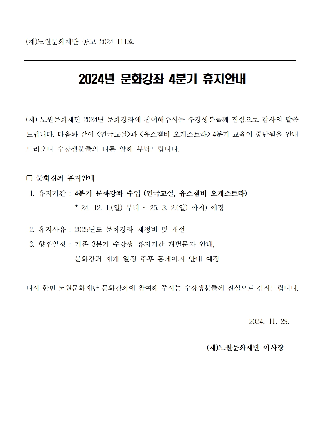 공지사항 2024년 문화강좌 4분기 휴지안내 2024.11.29 19,185 현재 URL 복사 블로그 바로가기 ※ 자세한 사항은 붙임파일 참고 부탁드립니다. 감사합니다. 첨부파일 #1: 1. 문화강좌 휴지안내문001.jpg 이전글 2025년 노원문화재단 문화시설 상반기 정기대관 선정 결과안내 다음글 노원구 문화자원 설문조사 목록
