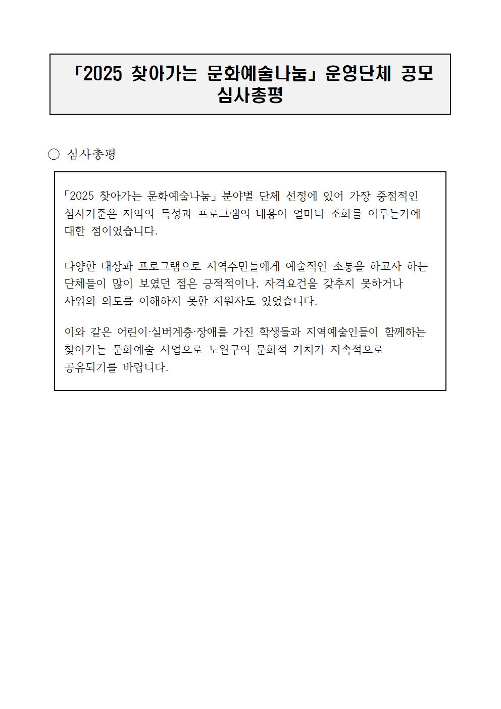 공지사항 「2025 찾아가는 문화예술나눔」 운영단체 선정 결과 안내 2025.03.19 12,011 현재 URL 복사 블로그 바로가기 첨부파일 #1: 심사총평.jpg 이전글 (재)노원문화재단 2025년 제1차 하우스 어셔 채용 안내 다음글 2025년 노원문화재단 청렴서한문 목록