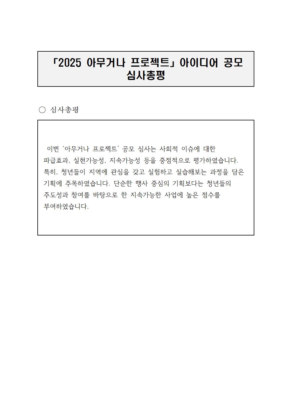 공지사항 「2025 아무거나 프로젝트」 아이디어 공모 선정 결과 발표 2025.06.20 4,263 현재 URL 복사 블로그 바로가기 첨부파일 #1: 심사총평.jpg 이전글 2025 와톤 예술숲 크라우드펀딩 공모 선정 결과 발표 다음글 <뉴욕의 거장들> 전시장 혼잡 안내 (7/8~7/11) 목록