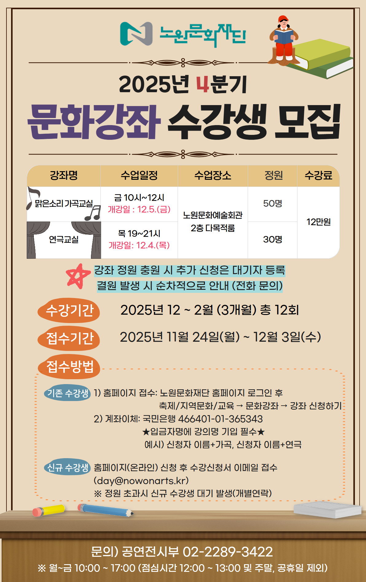 공지사항 2025년 4분기 문화강좌 수강생 모집(2025.11.24.~) 2025.11.24 103 현재 URL 복사 블로그 바로가기 ※문화강좌 신청하기(←CLICK) 수강신청서 서식: 아래 첨부파일 확인 첨부파일 #1: 노원문화재단+문화강좌+수강신청서(OOO) (1).hwp 이전글 2025년 노원문화재단 고객만족도조사 안내(11/27~12/7) 다음글 2025 노원스타N 본선 경연 순서 안내 목록