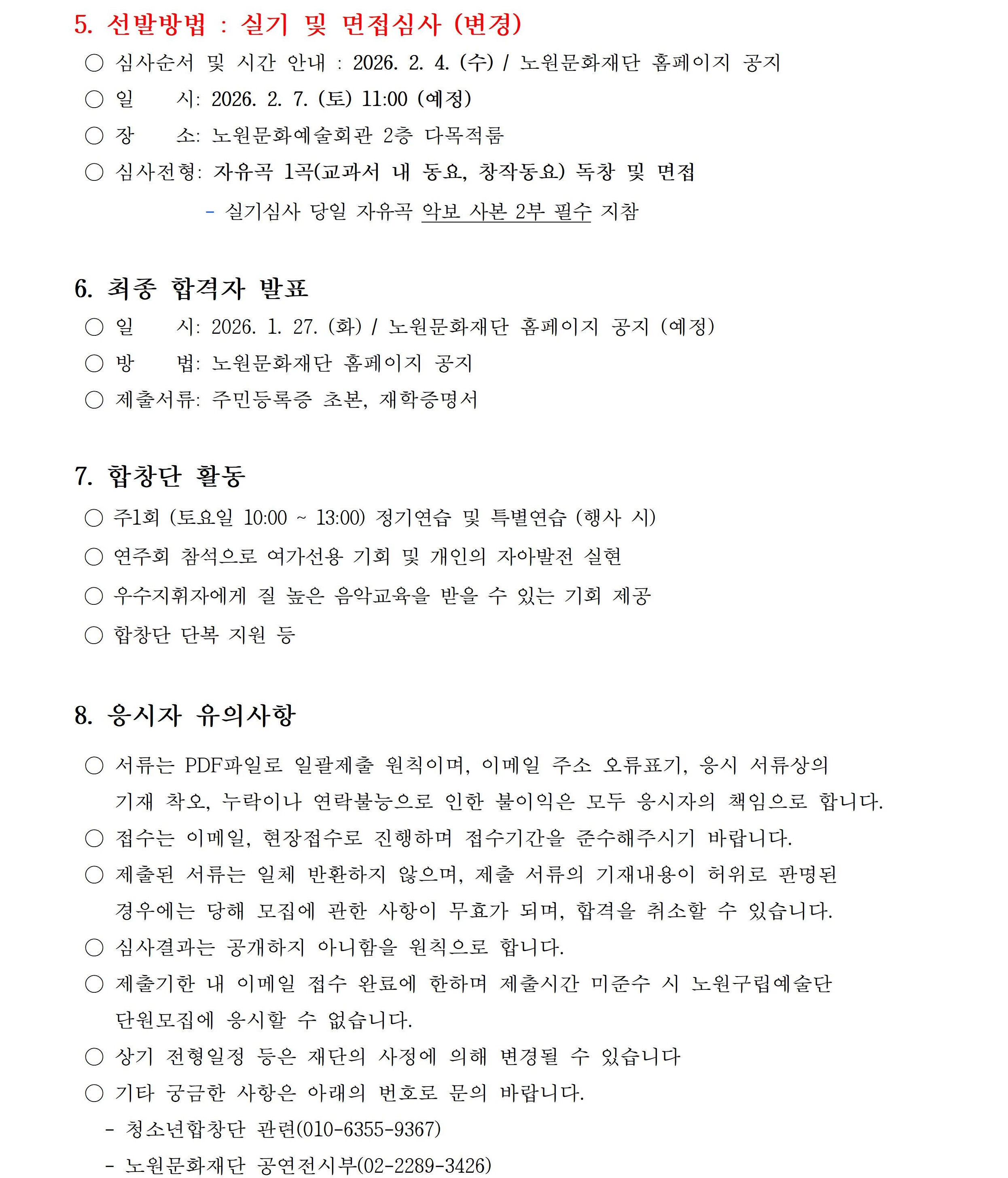 공지사항 2026 노원구립청소년합창단 신규단원 모집 (~2.3 17:00) 2025.12.24 310 현재 URL 복사 블로그 바로가기 첨부파일 #1: 2026 청소년합창단 신규단원 모집 지원서.hwp 첨부파일 #2: 2026 신규단원 모집 공고문(청소년합창단).pdf 이전글 2026 노원구립여성합창단 신규단원 모집 다음글 2026년 노원문화재단 문화시설 상반기 정기대관 공고 목록