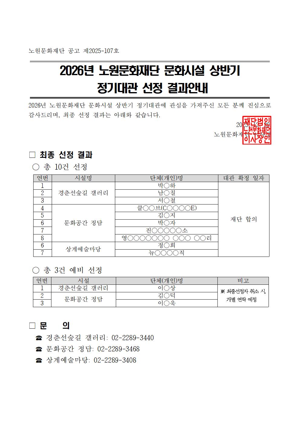 공지사항 2026년 노원문화재단 문화시설 상반기 정기대관 선정 결과안내 2025.12.27 507 현재 URL 복사 블로그 바로가기 이전글 2026 노원문화재단 웹진 노원아띠 PM·기자단 모집 다음글 노원문화예술회관 주차 혼잡에 따른 임시주차장 이용 안내 목록