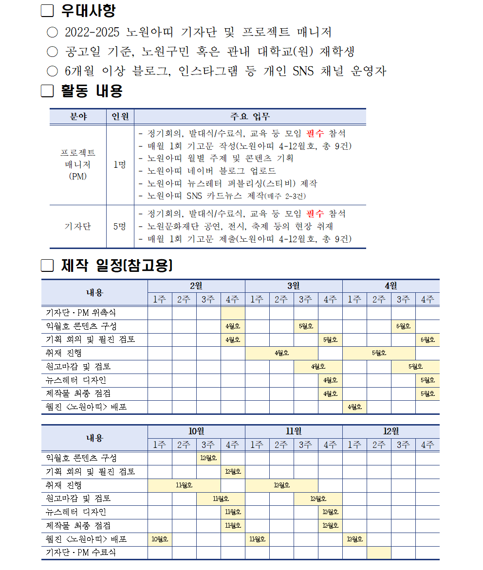 공지사항 2026 노원문화재단 웹진 노원아띠 PM·기자단 모집 2025.12.31 64 현재 URL 복사 블로그 바로가기 ◈ 2026 노원아띠 웹진 프로젝트 매니저 지원하기(클릭) ◈ 2026 노원아띠 웹진 기자단 지원하기(클릭) 다음글 2026년 노원문화재단 문화시설 상반기 정기대관 선정 결과안내 목록