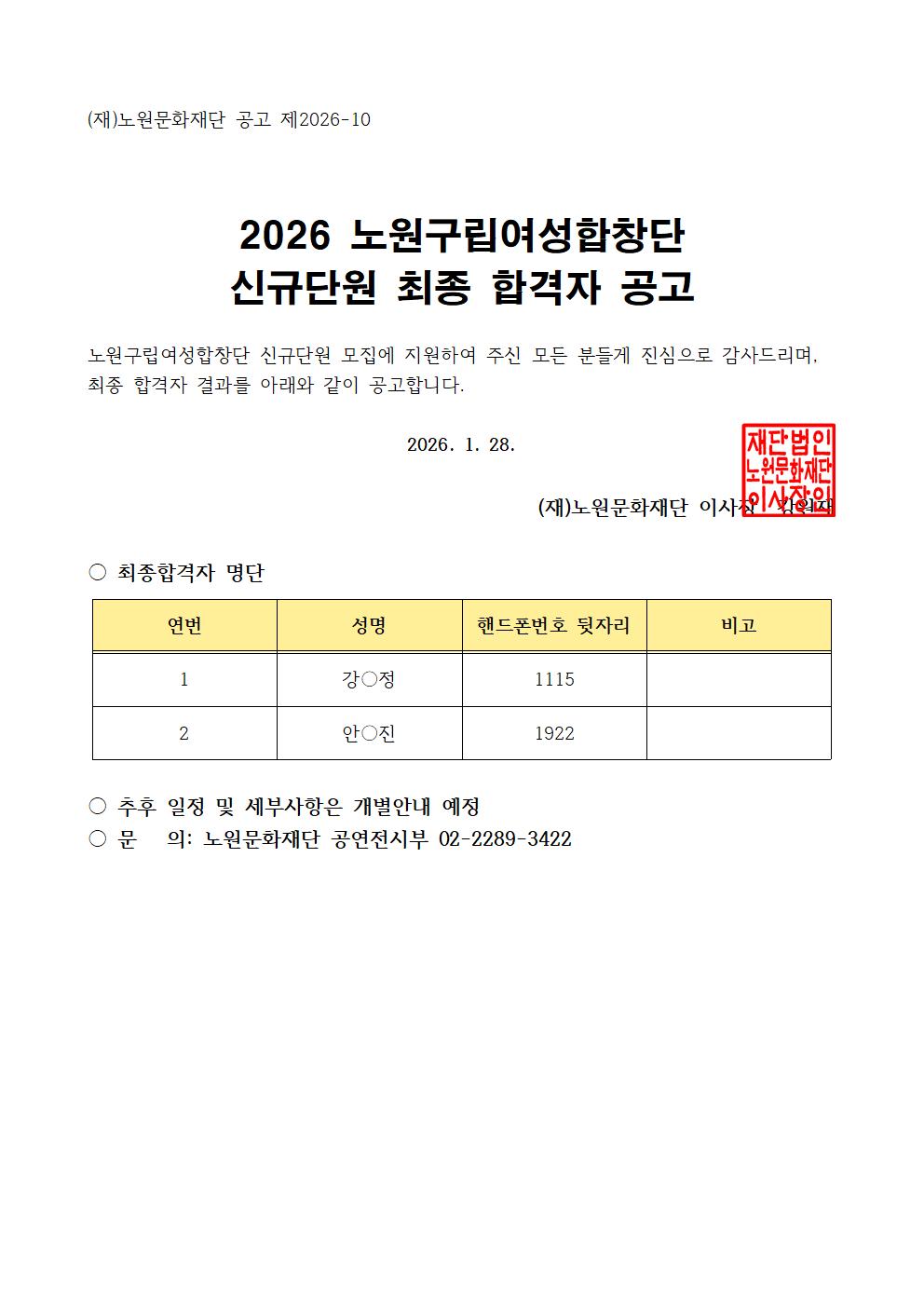 공지사항 [2026노원구립여성합창단] 신규단원 모집 결과 발표 2026.01.28 71 현재 URL 복사 블로그 바로가기 이전글 2026 노원구립청소년교향악단 총무 최종합격자 공고 다음글 노원구립청소년교향악단 총무 채용 면접 안내 목록