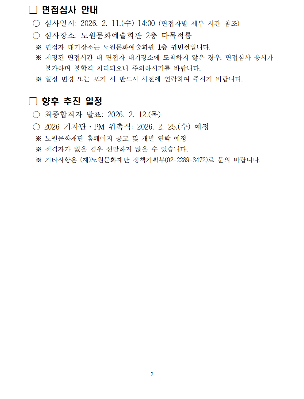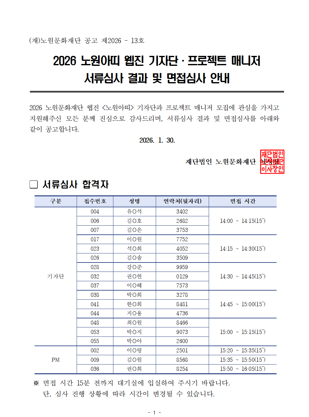 공지사항 2026 노원아띠 웹진 기자단·프로젝트 매니저 서류심사 결과 및 면접심사 안내 2026.01.30 252 현재 URL 복사 블로그 바로가기 이전글 <인상파, 찬란한 순간들> 설 연휴 운영 안내_2/17(화) 휴관 다음글 2026 노원구립청소년교향악단 총무 최종합격자 공고 목록