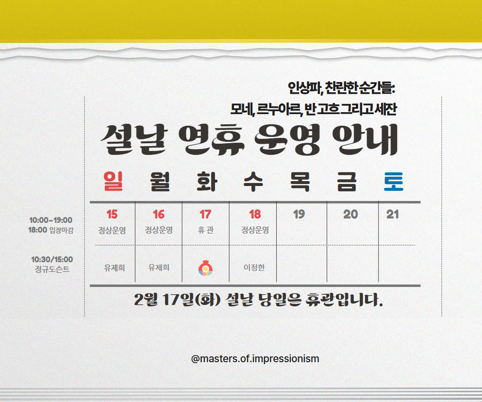 공지사항 <인상파, 찬란한 순간들> 설 연휴 운영 안내_2/17(화) 휴관 2026.02.02 100 현재 URL 복사 블로그 바로가기 🔗 전시 안내 바로가기 https://vo.la/3f5401 다음글 2026 노원아띠 웹진 기자단·프로젝트 매니저 서류심사 결과 및 면접심사 안내 목록
