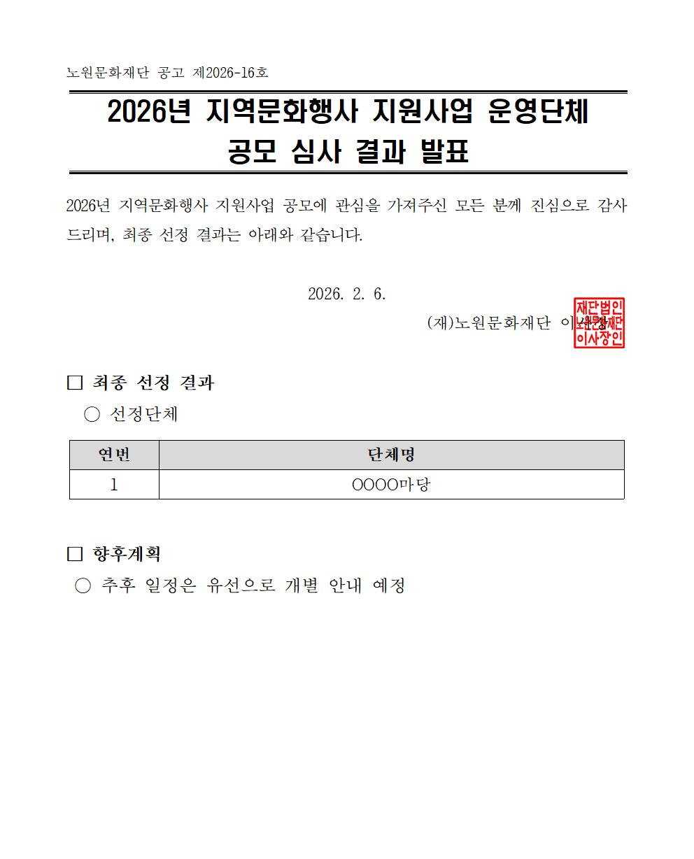 공지사항 2026 지역문화행사 지원사업 공모 심사 결과 발표 2026.02.06 27 현재 URL 복사 블로그 바로가기 이전글 2026 제5회 노원 어린이청소년 연극제 운영단체 공모 다음글 2026 노원구립청소년합창단 신규단원 모집 오디션 일정 안내 목록