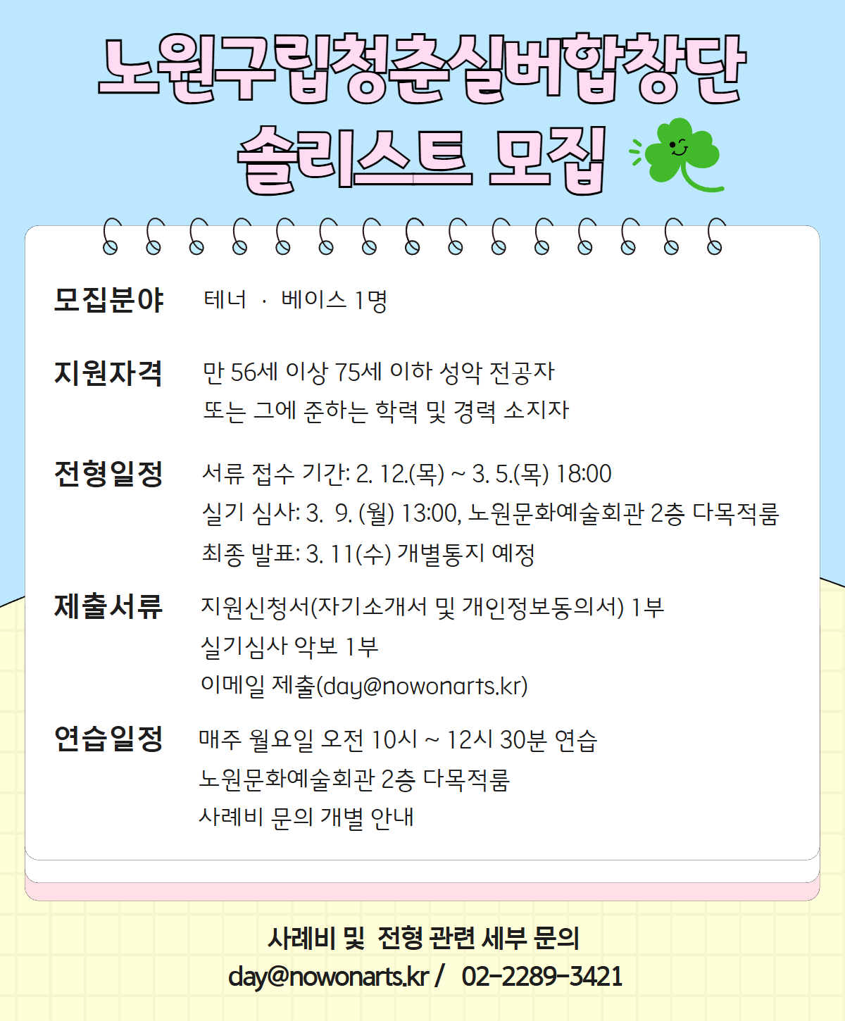 공지사항 2026 노원구립청춘실버합창단 신규 솔리스트 모집 2026.02.11 92 현재 URL 복사 블로그 바로가기 첨부파일 #1: 2. 지원자 제출양식.hwp 다음글 2026 노원구립청소년합창단 신규단원 모집 최종합격자 공고 목록