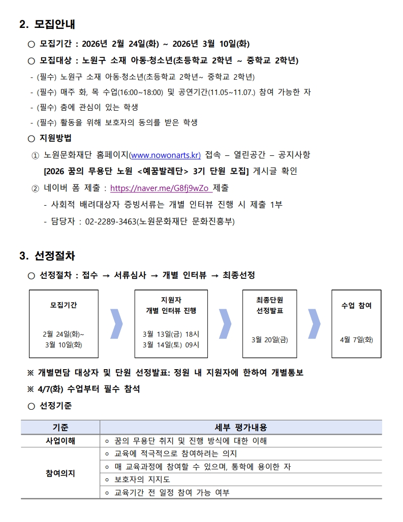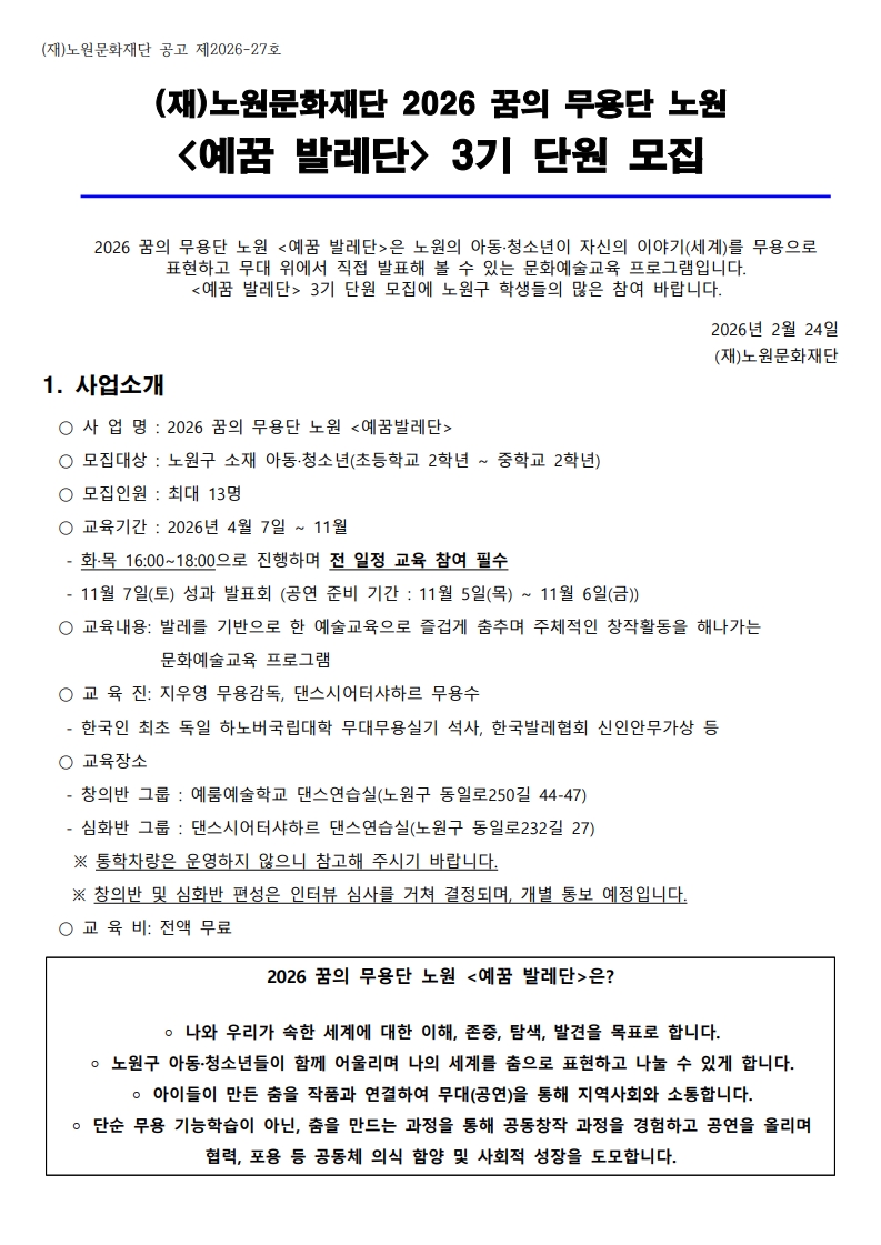 공지사항 2026 꿈의 무용단 노원 예꿈발레단 3기 단원 모집 2026.02.24 174 현재 URL 복사 블로그 바로가기 모집 신청 : https://naver.me/G8fj9wZo 첨부파일 #1: 모집 공고문.pdf 다음글 문화공간 정담 운영시간 변경 안내 목록