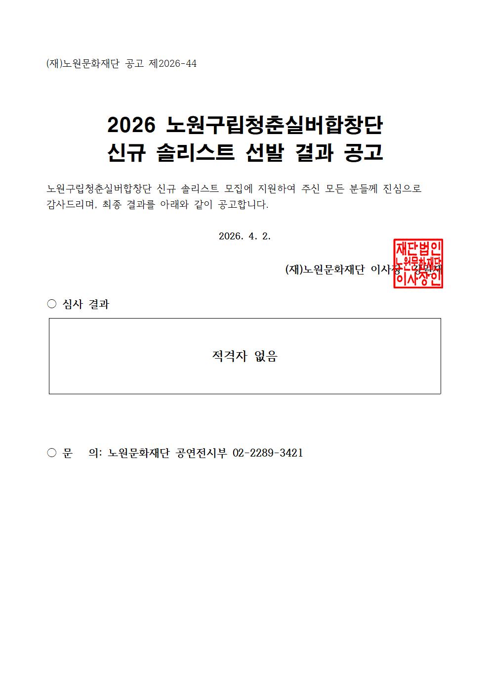 공지사항 [2026 노원구립청춘실버합창단] 신규 솔리스트 선발 결과 발표 2026.04.02 36 현재 URL 복사 블로그 바로가기 이전글 「2026 노원 생활문화 이야기(전시지원, 활동제안)」동아리 지원사업 공모 다음글 2026년 노원구립청소년교향악단 신규단원 모집 공고 목록