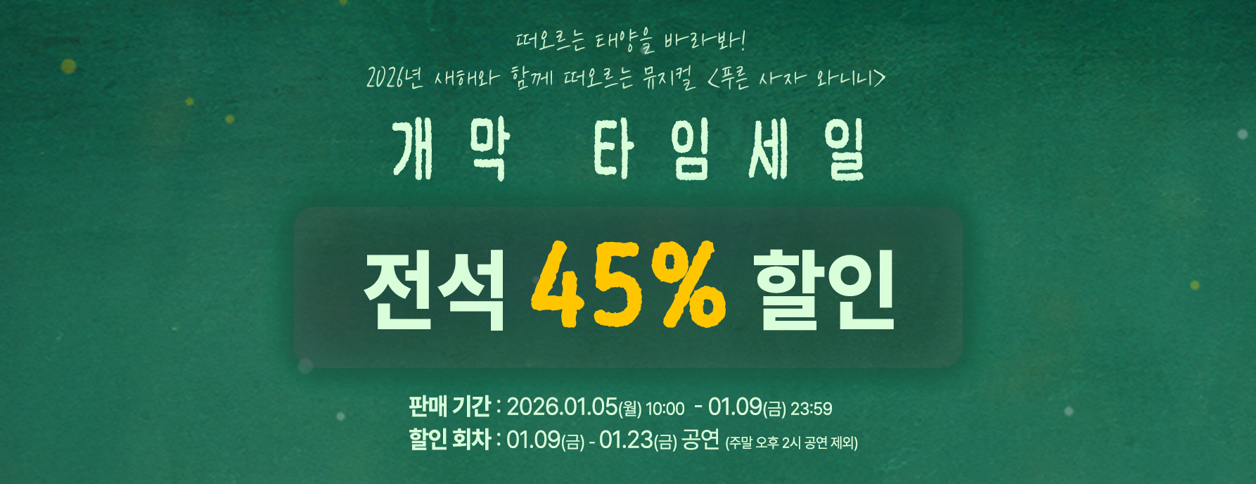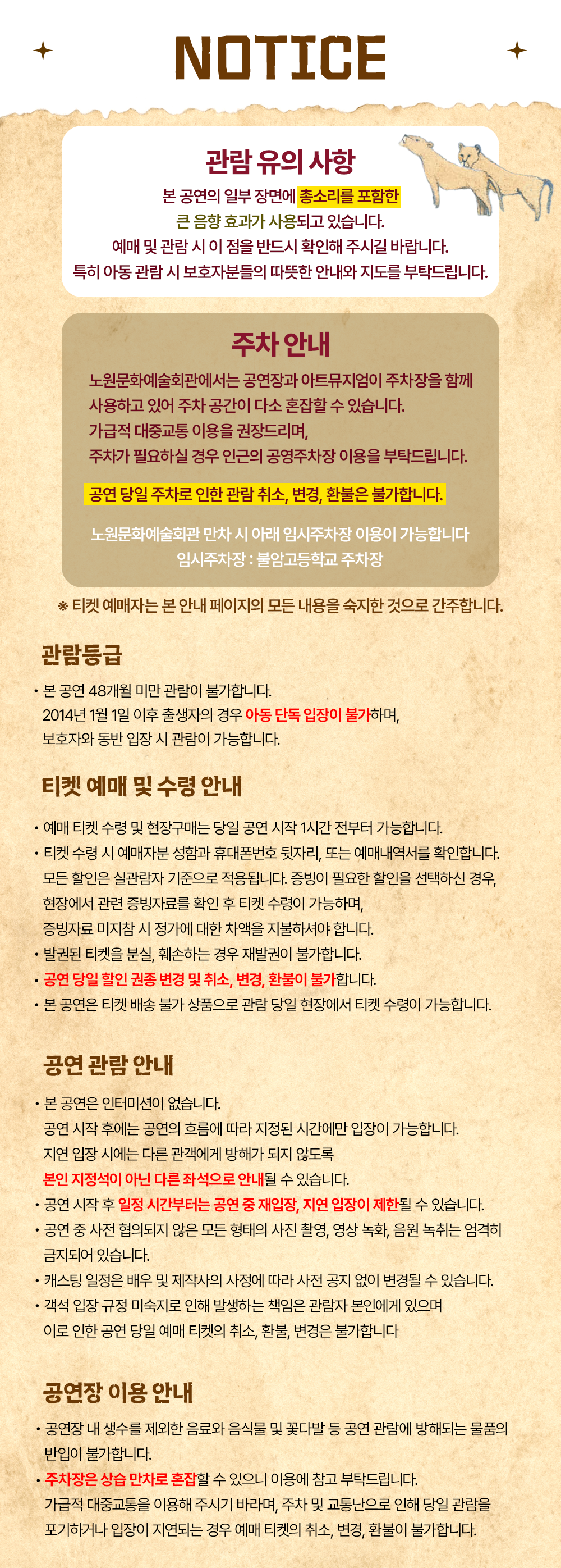 공연 공동기획 종료 2026 공동기획공연 뮤지컬 <푸른사자 와니니> 공연일시 2026.01.03(토) ~ 2026.01.25(일) 공연시간 금 20시 / 토 14시, 17시, 20시 / 일 14시, 18시 장 소 노원문화예술회관 대공연장 티 켓 R석 88,000원 / S석 55,000원 장 르 뮤지컬 관람연령 48개월 이상 현재 URL 복사 블로그 바로가기 예매하기 목록 공연정보 티켓예매 및 취소시 유의사항 할인정보 공지사항 공연정보 티켓예매 및 취소시 유의사항 할인 증빙자료 미지참시 현장에서 정가에 대한 차액을 현금으로 지불하셔야 티켓수령이 가능합니다. 예매취소는 공연전날 오후 5시까지 가능합니다. 취소는 예매하신 예매채널에서 가능합니다. 취소 마감시간 이후에는 예매취소, 환불 및 변경이 불가합니다. 취소일자에 따라서 취소 수수료가 부과되며 예매일 기준보다 관람일 기준이 우선 적용됩니다. 예매취소조건 안내 테이블로 취소일, 취소수수료에 따라 작성되었습니다. 예매취소조건 취소일 취소수수료 예매 후 7일이내 없음 예매 후 8일~관람일 10일전까지 장당 4,000원(티켓금액의 10% 한도) 관람일 9일전~7일전까지 티켓 금액의 10% 관람일 6일전~3일전까지 티켓 금액의 20% 관람일 2일전~1일전까지 티켓 금액의 30% ※ 티켓이 분실, 훼손된 경우에는 재발권이 불가하오니 티켓 보관에 유의하시기 바랍니다. 목록