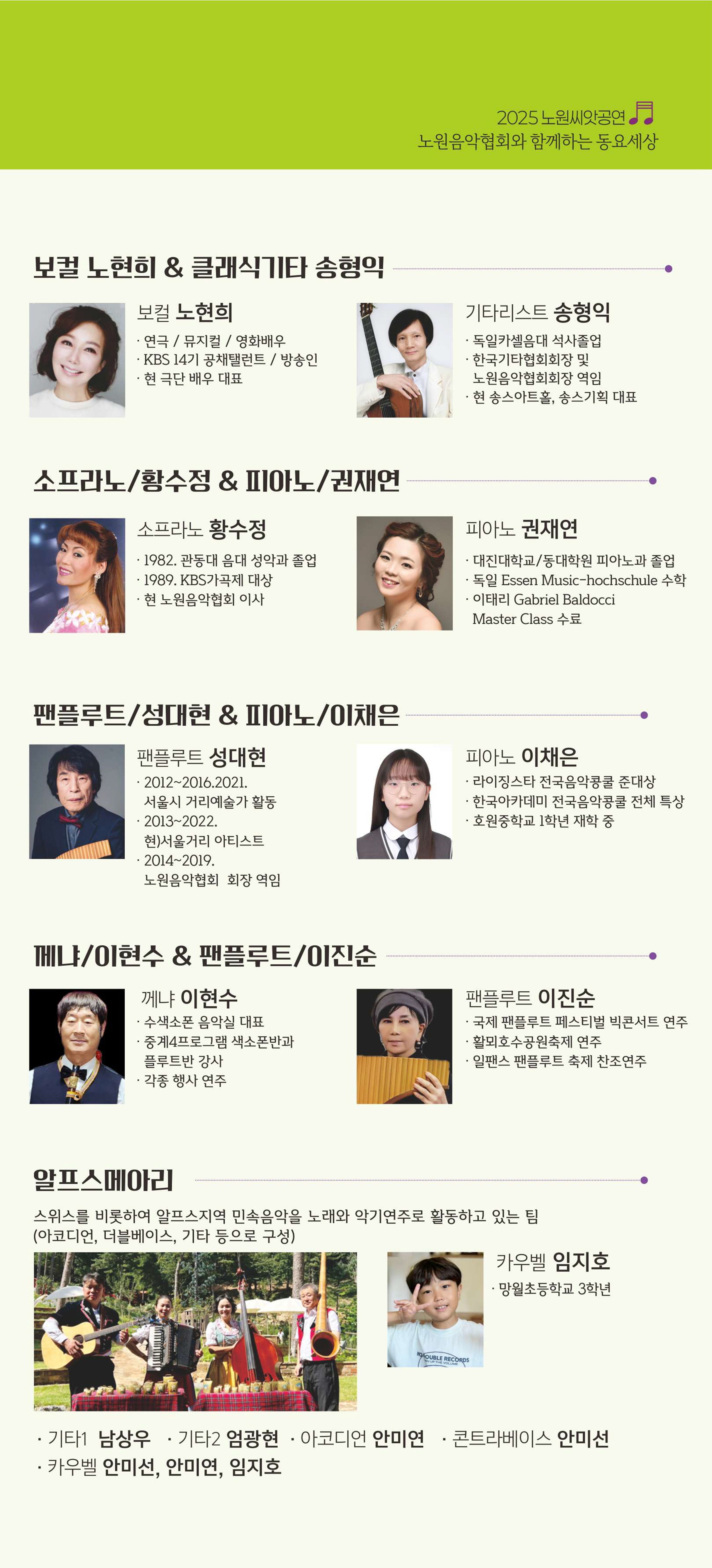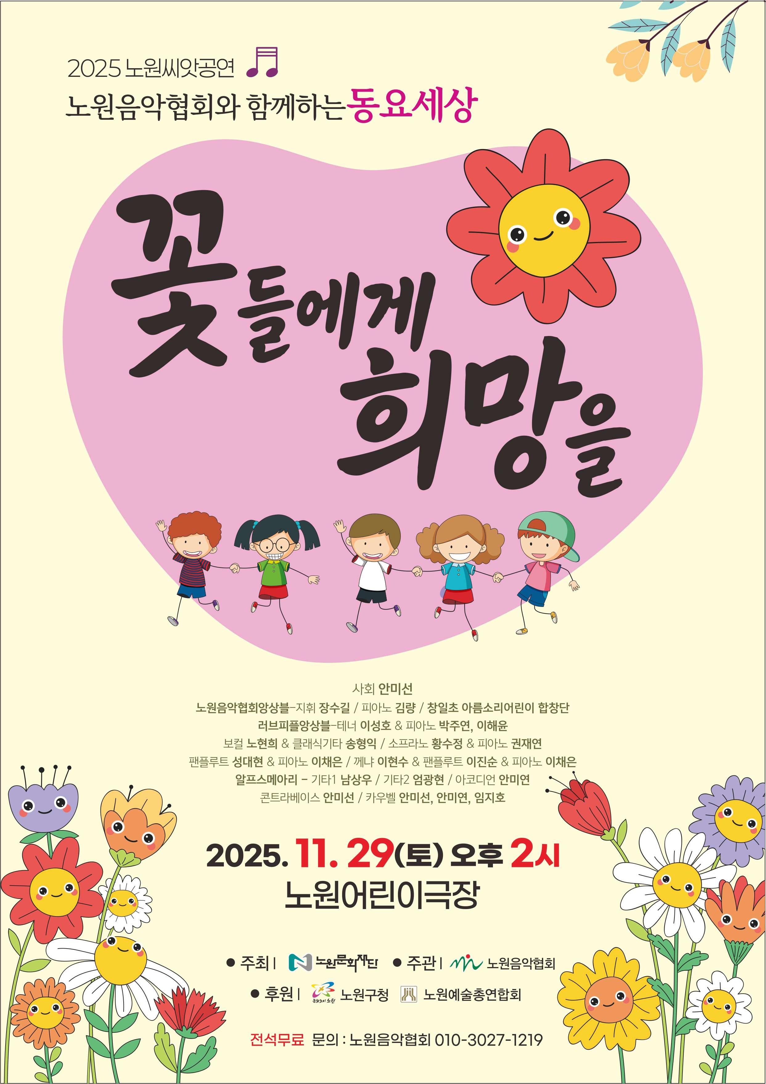 공연 지원사업 예정 2025 노원예술씨앗 지원사업 노원음악협회 <꽃들에게 희망을> 공연일시 2025.11.29(토) ~ 2025.11.29(토) 공연시간 오후 2시 장 소 노원어린이극장 티 켓 전석무료 장 르 음악(동요) 관람연령 36개월 이상 현재 URL 복사 블로그 바로가기 목록 공연정보 티켓예매 및 취소시 유의사항 티켓예매 및 취소시 유의사항 할인 증빙자료 미지참시 현장에서 정가에 대한 차액을 현금으로 지불하셔야 티켓수령이 가능합니다. 예매취소는 공연전날 오후 5시까지 가능합니다. 취소는 예매하신 예매채널에서 가능합니다. 취소 마감시간 이후에는 예매취소, 환불 및 변경이 불가합니다. 취소일자에 따라서 취소 수수료가 부과되며 예매일 기준보다 관람일 기준이 우선 적용됩니다. 예매취소조건 안내 테이블로 취소일, 취소수수료에 따라 작성되었습니다. 예매취소조건 취소일 취소수수료 예매 후 7일이내 없음 예매 후 8일~관람일 10일전까지 장당 4,000원(티켓금액의 10% 한도) 관람일 9일전~7일전까지 티켓 금액의 10% 관람일 6일전~3일전까지 티켓 금액의 20% 관람일 2일전~1일전까지 티켓 금액의 30% ※ 티켓이 분실, 훼손된 경우에는 재발권이 불가하오니 티켓 보관에 유의하시기 바랍니다. 목록