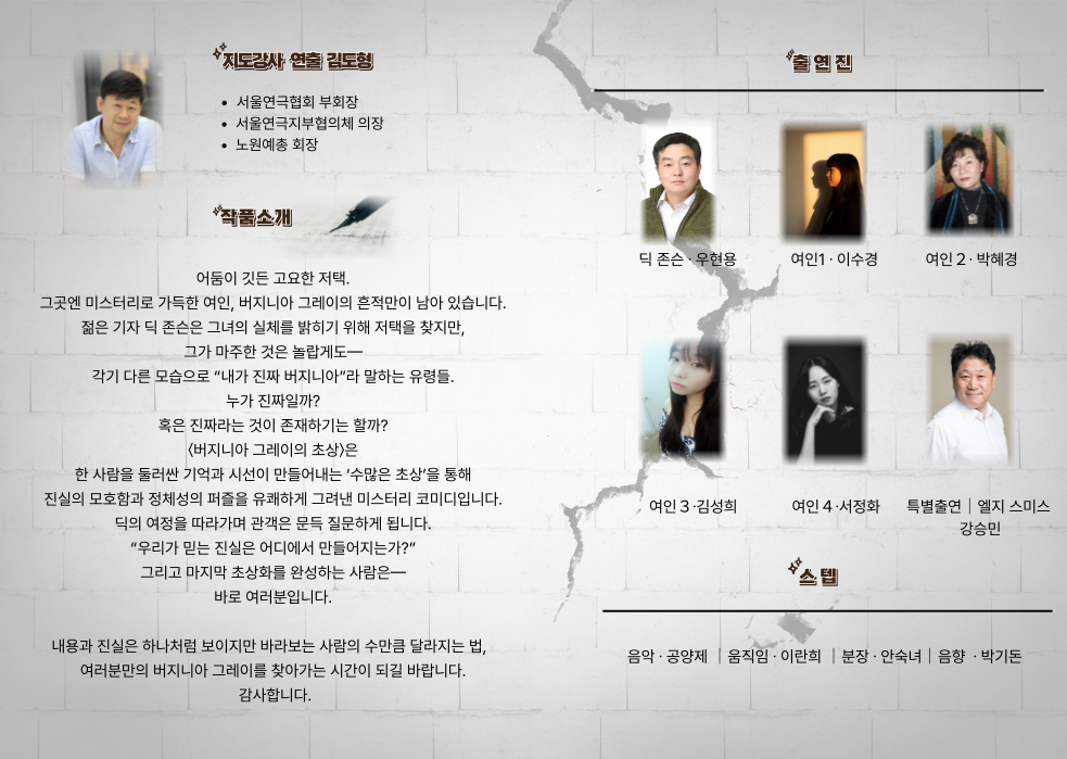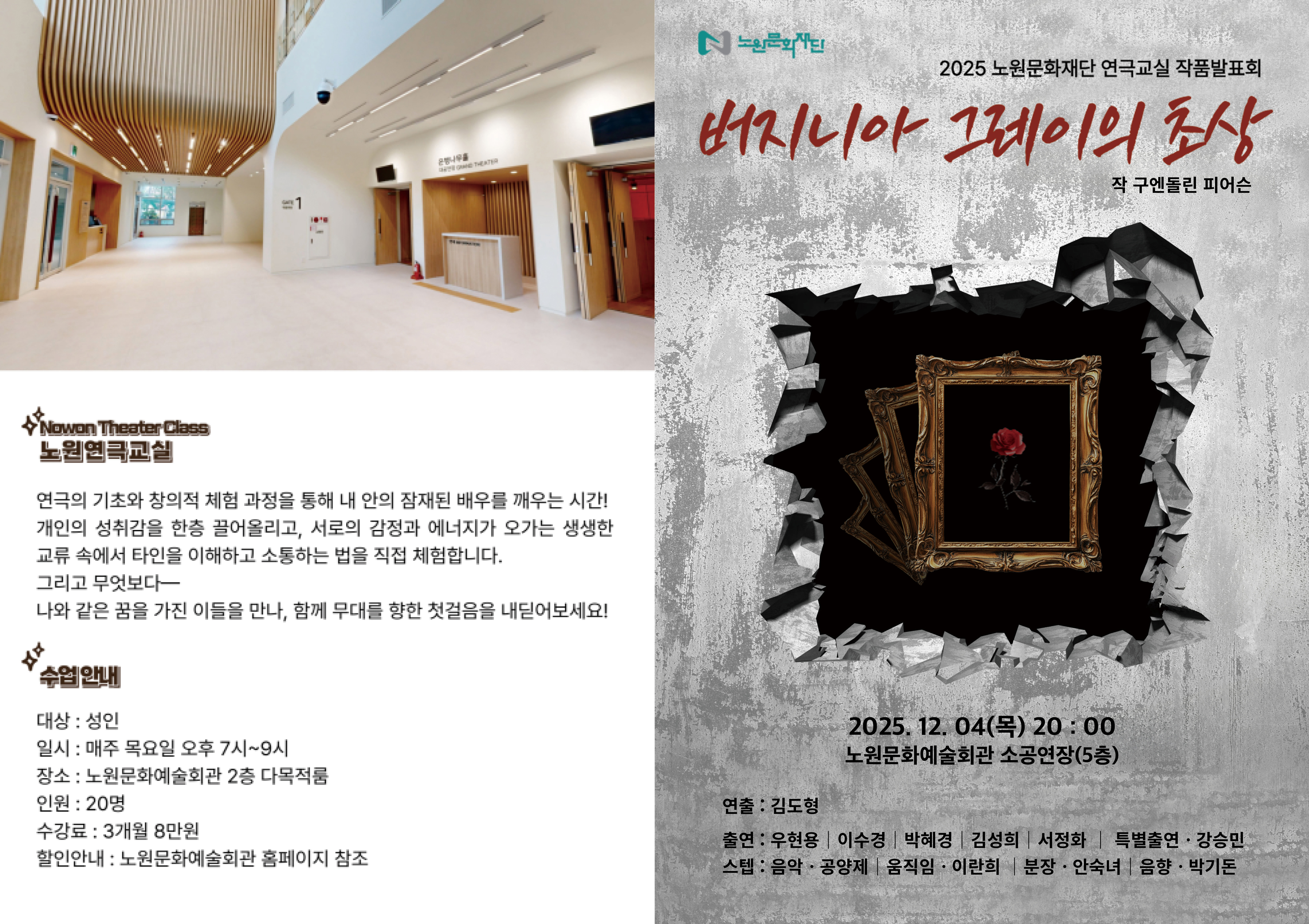 공연 기획공연 예정 2025 문화강좌 연극교실 낭독발표회 <버지니아그레이의 초상> 공연일시 2025.12.04(목) ~ 2025.12.04(목) 공연시간 20:00 장 소 노원문화예술회관 소공연장 티 켓 전석 무료 장 르 낭독발표회 관람연령 누구나 현재 URL 복사 블로그 바로가기 목록 공연정보 티켓예매 및 취소시 유의사항 티켓예매 및 취소시 유의사항 할인 증빙자료 미지참시 현장에서 정가에 대한 차액을 현금으로 지불하셔야 티켓수령이 가능합니다. 예매취소는 공연전날 오후 5시까지 가능합니다. 취소는 예매하신 예매채널에서 가능합니다. 취소 마감시간 이후에는 예매취소, 환불 및 변경이 불가합니다. 취소일자에 따라서 취소 수수료가 부과되며 예매일 기준보다 관람일 기준이 우선 적용됩니다. 예매취소조건 안내 테이블로 취소일, 취소수수료에 따라 작성되었습니다. 예매취소조건 취소일 취소수수료 예매 후 7일이내 없음 예매 후 8일~관람일 10일전까지 장당 4,000원(티켓금액의 10% 한도) 관람일 9일전~7일전까지 티켓 금액의 10% 관람일 6일전~3일전까지 티켓 금액의 20% 관람일 2일전~1일전까지 티켓 금액의 30% ※ 티켓이 분실, 훼손된 경우에는 재발권이 불가하오니 티켓 보관에 유의하시기 바랍니다. 목록