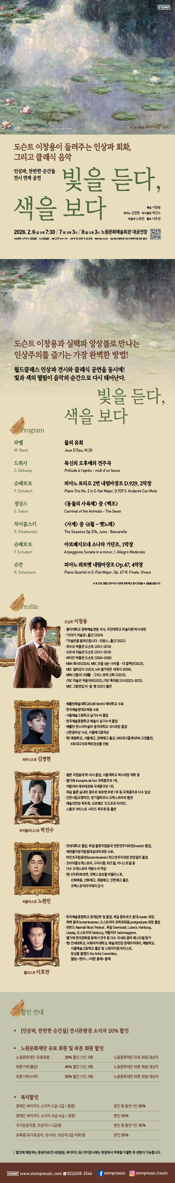 공연 공동기획 예정 인상파, 찬란한 순간들 전시 연계 공연 <빛을 듣다, 색을 보다> 공연일시 2026.02.06(금) ~ 2026.02.08(일) 공연시간 금 19:30, 토 15:00, 일 15:00 장 소 노원문화예술회관 대공연장 티 켓 R석 55,000원 / S석 40,000원 장 르 클래식 관람연령 초등학생이상 관람가 현재 URL 복사 블로그 바로가기 예매하기 목록 공연정보 티켓예매 및 취소시 유의사항 공연문의 스톰프뮤직 02-2658-3546 공연시간 러닝타임 80분 2026. 2. 6. ~2026. 2. 8. 금 19:30, 토 15:00, 일 15:00 티켓예매 및 취소시 유의사항 할인 증빙자료 미지참시 현장에서 정가에 대한 차액을 현금으로 지불하셔야 티켓수령이 가능합니다. 예매취소는 공연전날 오후 5시까지 가능합니다. 취소는 예매하신 예매채널에서 가능합니다. 취소 마감시간 이후에는 예매취소, 환불 및 변경이 불가합니다. 취소일자에 따라서 취소 수수료가 부과되며 예매일 기준보다 관람일 기준이 우선 적용됩니다. 예매취소조건 안내 테이블로 취소일, 취소수수료에 따라 작성되었습니다. 예매취소조건 취소일 취소수수료 예매 후 7일이내 없음 예매 후 8일~관람일 10일전까지 장당 4,000원(티켓금액의 10% 한도) 관람일 9일전~7일전까지 티켓 금액의 10% 관람일 6일전~3일전까지 티켓 금액의 20% 관람일 2일전~1일전까지 티켓 금액의 30% ※ 티켓이 분실, 훼손된 경우에는 재발권이 불가하오니 티켓 보관에 유의하시기 바랍니다. 목록