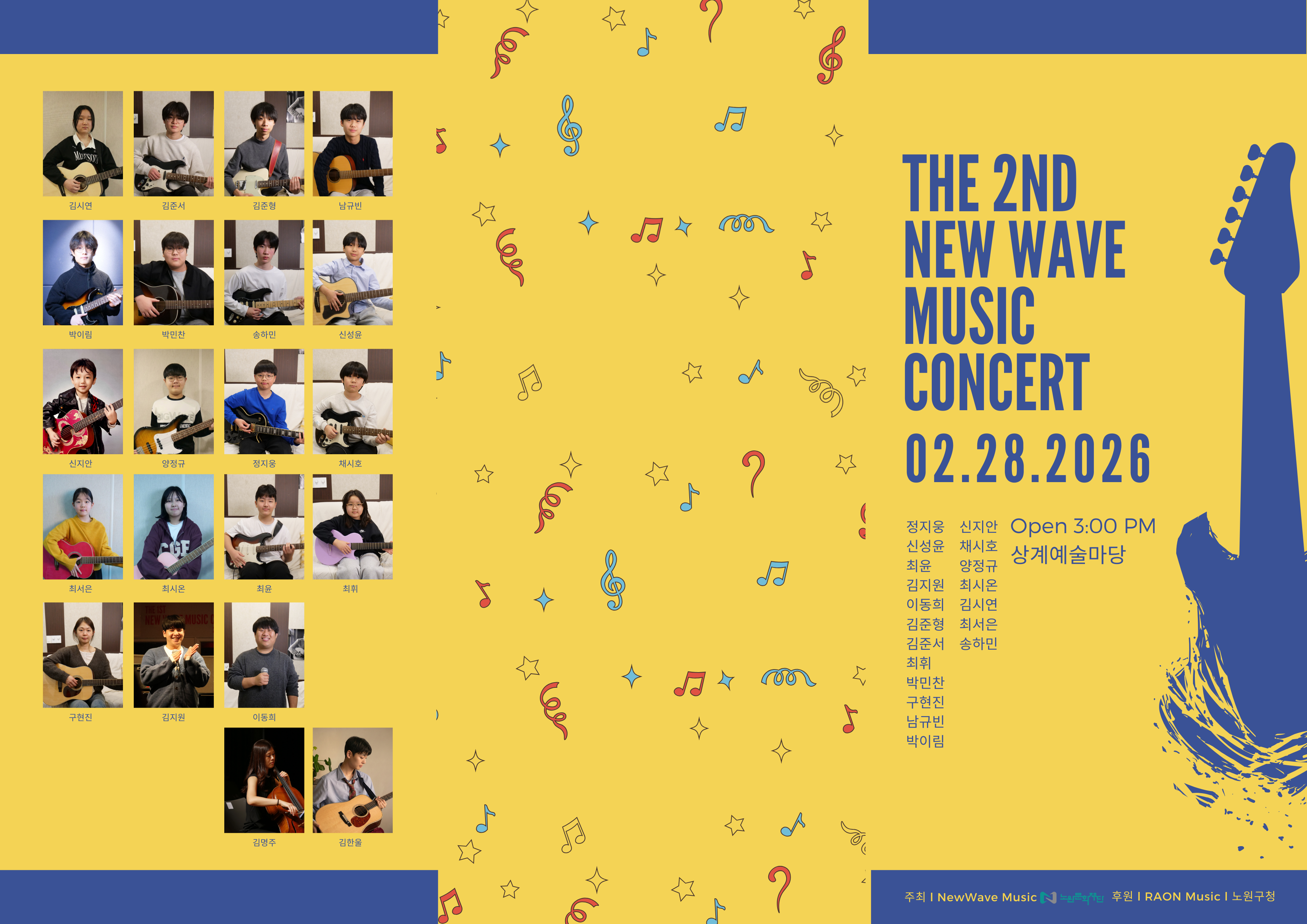 공연 대관공연 예정 대관공연(상계예술마당) / 'The 2nd NEW WAVE MUSIC CONCERT' 공연일시 2026.02.28(토) ~ 2026.02.28(토) 공연시간 15:00 장 소 상계예술마당 티 켓 무료 장 르 음악공연 관람연령 전연령 현재 URL 복사 블로그 바로가기 목록 공연정보 티켓예매 및 취소시 유의사항 티켓예매 및 취소시 유의사항 할인 증빙자료 미지참시 현장에서 정가에 대한 차액을 현금으로 지불하셔야 티켓수령이 가능합니다. 예매취소는 공연전날 오후 5시까지 가능합니다. 취소는 예매하신 예매채널에서 가능합니다. 취소 마감시간 이후에는 예매취소, 환불 및 변경이 불가합니다. 취소일자에 따라서 취소 수수료가 부과되며 예매일 기준보다 관람일 기준이 우선 적용됩니다. 예매취소조건 안내 테이블로 취소일, 취소수수료에 따라 작성되었습니다. 예매취소조건 취소일 취소수수료 예매 후 7일이내 없음 예매 후 8일~관람일 10일전까지 장당 4,000원(티켓금액의 10% 한도) 관람일 9일전~7일전까지 티켓 금액의 10% 관람일 6일전~3일전까지 티켓 금액의 20% 관람일 2일전~1일전까지 티켓 금액의 30% ※ 티켓이 분실, 훼손된 경우에는 재발권이 불가하오니 티켓 보관에 유의하시기 바랍니다. 목록
