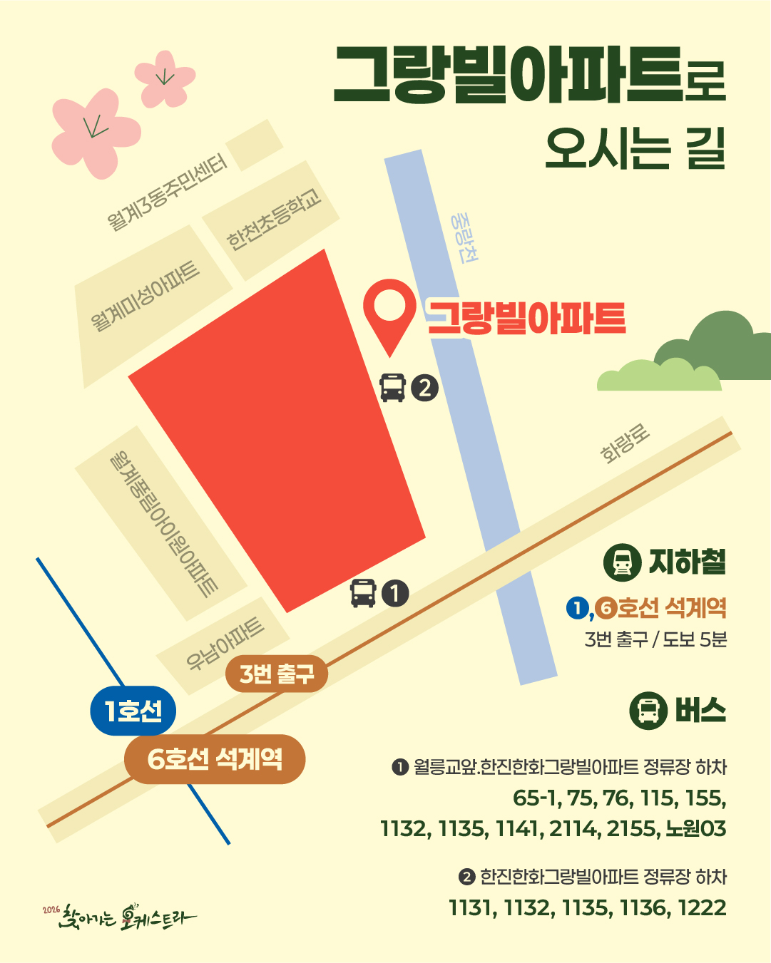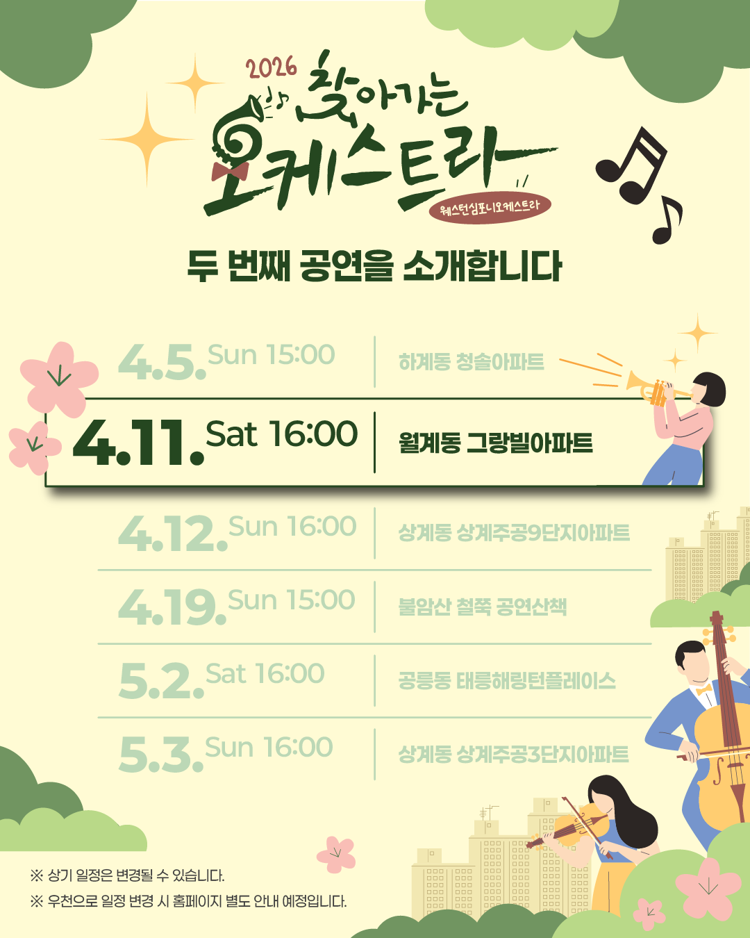 공연 기획공연 예정 2026 찾아가는 오케스트라|4월 11일 16시 그랑빌아파트 공연일시 2026.04.11(토) ~ 2026.04.11(토) 공연시간 16:00 장 소 월계동 그랑빌아파트 중앙광장 티 켓 - 장 르 클래식, 대중음악 관람연령 노원구민 누구나 관람 가능 / 사전신청 없음 현재 URL 복사 블로그 바로가기 목록 공연정보 티켓예매 및 취소시 유의사항 티켓예매 및 취소시 유의사항 할인 증빙자료 미지참시 현장에서 정가에 대한 차액을 현금으로 지불하셔야 티켓수령이 가능합니다. 예매취소는 공연전날 오후 5시까지 가능합니다. 취소는 예매하신 예매채널에서 가능합니다. 취소 마감시간 이후에는 예매취소, 환불 및 변경이 불가합니다. 취소일자에 따라서 취소 수수료가 부과되며 예매일 기준보다 관람일 기준이 우선 적용됩니다. 예매취소조건 안내 테이블로 취소일, 취소수수료에 따라 작성되었습니다. 예매취소조건 취소일 취소수수료 예매 후 7일이내 없음 예매 후 8일~관람일 10일전까지 장당 4,000원(티켓금액의 10% 한도) 관람일 9일전~7일전까지 티켓 금액의 10% 관람일 6일전~3일전까지 티켓 금액의 20% 관람일 2일전~1일전까지 티켓 금액의 30% ※ 티켓이 분실, 훼손된 경우에는 재발권이 불가하오니 티켓 보관에 유의하시기 바랍니다. 목록