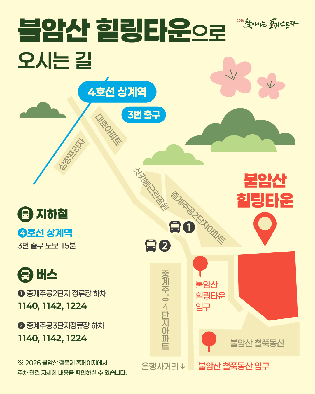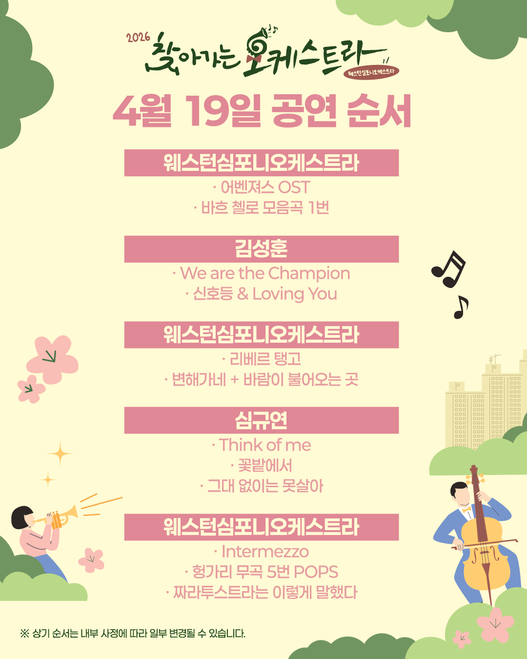공연 기획공연 예정 2026 찾아가는 오케스트라|4월 19일 15시 불암산 힐링타운 공연일시 2026.04.19(일) ~ 2026.04.19(일) 공연시간 15:00 장 소 중계동 불암산 힐링타운(불암산 철쭉제) 티 켓 - 장 르 클래식, 대중음악 관람연령 노원구민 누구나 관람 가능 / 사전신청 없음 현재 URL 복사 블로그 바로가기 목록 공연정보 티켓예매 및 취소시 유의사항 <2026 찾아가는 오케스트라> 4월 19일 공연은 <2026년 불암산 철쭉제>와 함께 합니다!🌸🎵👉 2026년 불암산 철쭉제 홈페이지 바로가기 티켓예매 및 취소시 유의사항 할인 증빙자료 미지참시 현장에서 정가에 대한 차액을 현금으로 지불하셔야 티켓수령이 가능합니다. 예매취소는 공연전날 오후 5시까지 가능합니다. 취소는 예매하신 예매채널에서 가능합니다. 취소 마감시간 이후에는 예매취소, 환불 및 변경이 불가합니다. 취소일자에 따라서 취소 수수료가 부과되며 예매일 기준보다 관람일 기준이 우선 적용됩니다. 예매취소조건 안내 테이블로 취소일, 취소수수료에 따라 작성되었습니다. 예매취소조건 취소일 취소수수료 예매 후 7일이내 없음 예매 후 8일~관람일 10일전까지 장당 4,000원(티켓금액의 10% 한도) 관람일 9일전~7일전까지 티켓 금액의 10% 관람일 6일전~3일전까지 티켓 금액의 20% 관람일 2일전~1일전까지 티켓 금액의 30% ※ 티켓이 분실, 훼손된 경우에는 재발권이 불가하오니 티켓 보관에 유의하시기 바랍니다. 목록