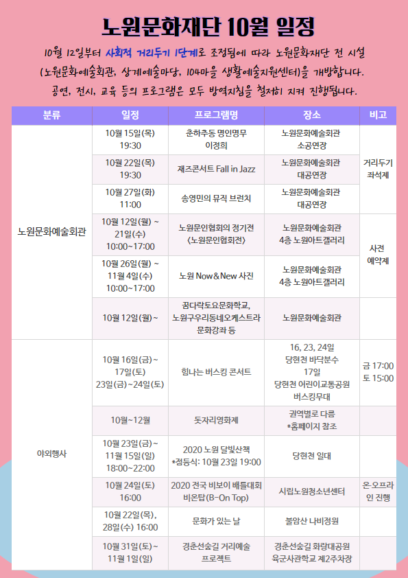 노원문화재단(이사장 김승국)은 사회적 거리두기 1단계 전환과 함께 공연·전시·행사·교육 등 프로그램과 노원문화예술회관, 상계예술마당, 104마을 생활예술지원센터 등 시설 운영을 10월 12일부터 재개한다고 밝혔다.