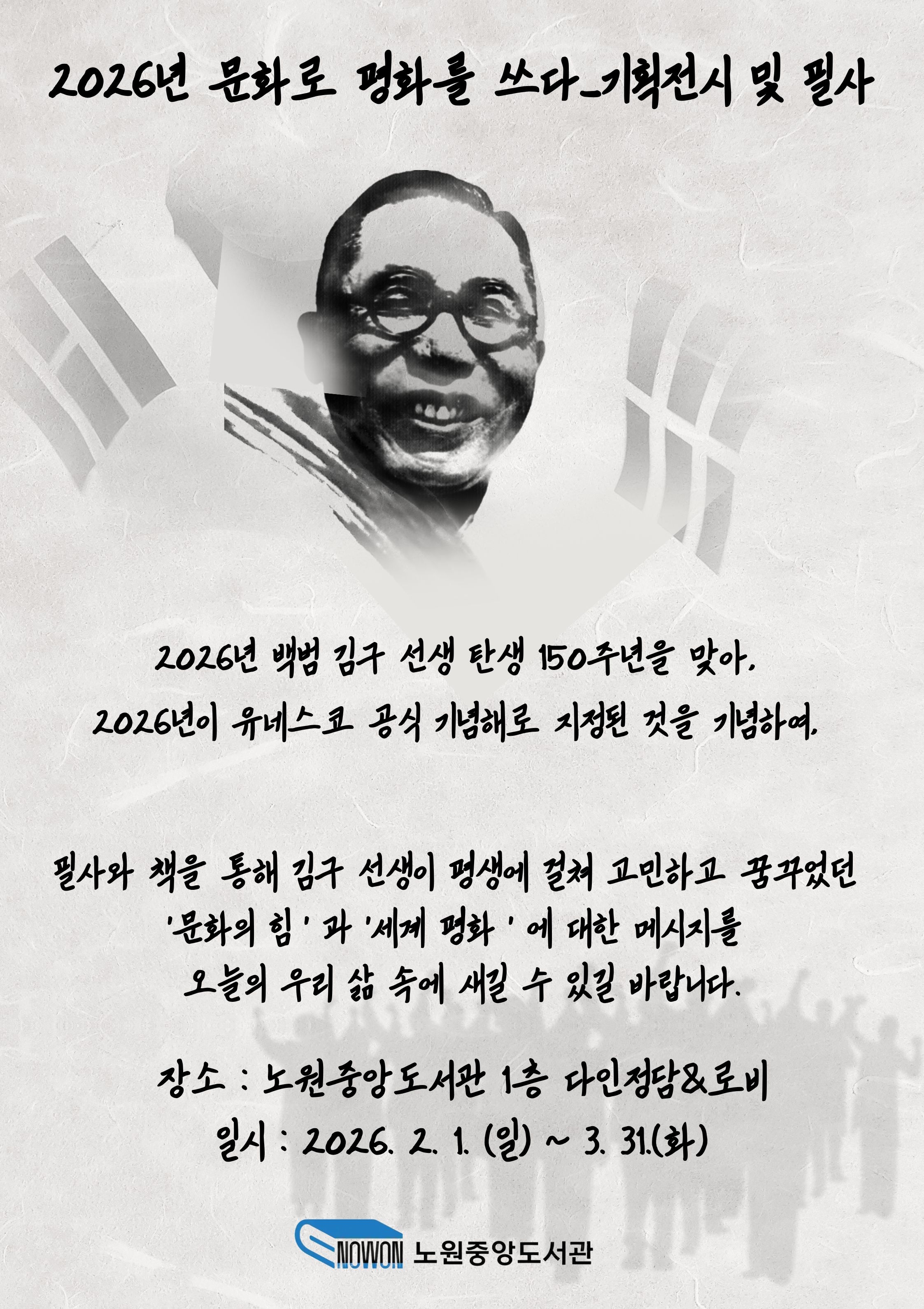 이번 전시는 2월 1일부터 노원중앙도서관 1층 로비에서 진행되며, 김구 선생의 철학과 메시지를 ‘문화의 힘’이라는 키워드로 풀어낸 주제 전시와 그의 어록을 직접 따라 쓰며 사유할 수 있는 ‘다인정담 필사존’으로 구성됐다. 전시는 도서관을 찾는 시민 누구나 자유롭게 관람하고 참여할 수 있다.