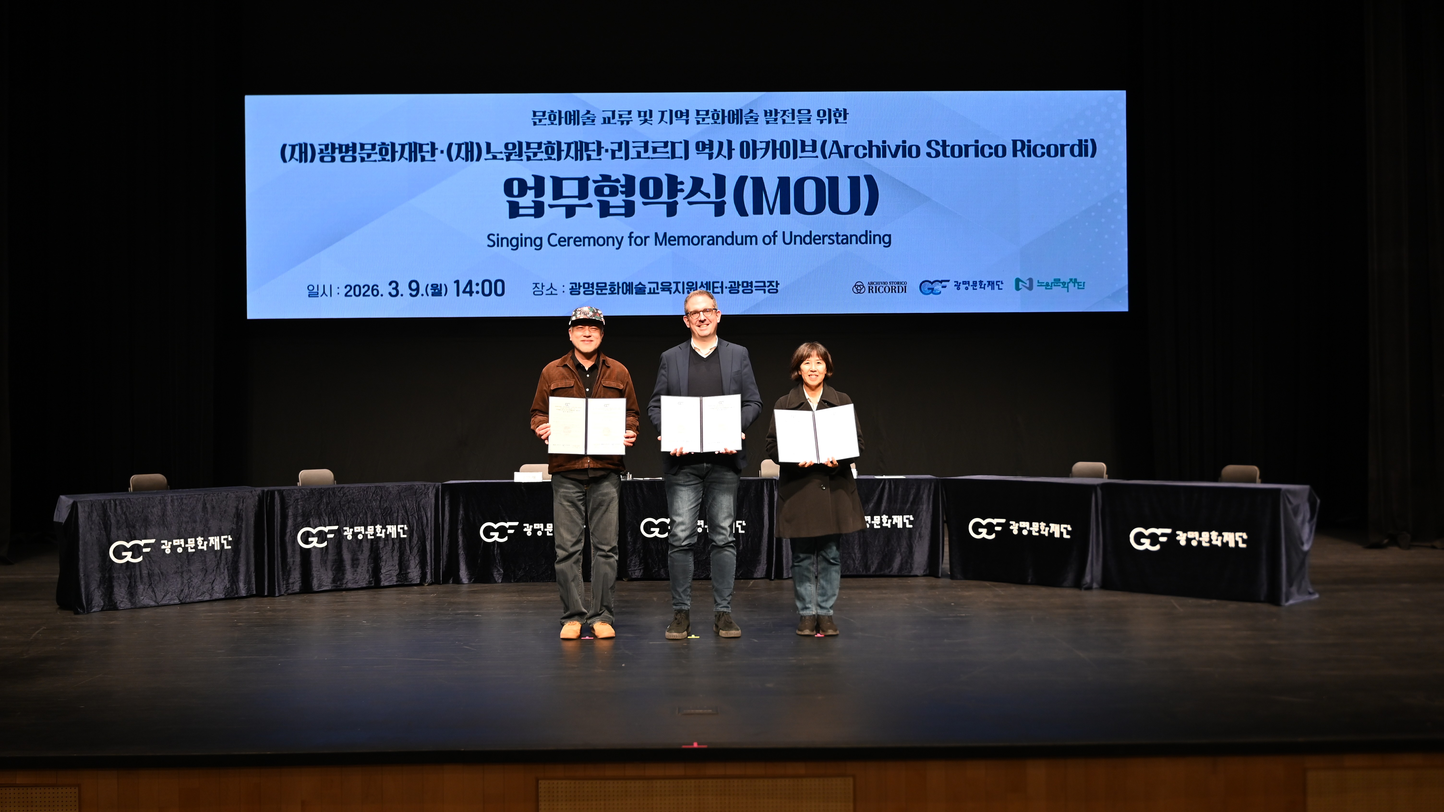 노원문화재단(이사장 강원재)이 3월 9일(월) 오후 2시 광명극장에서 (재)노원문화재단, (재)광명문화재단, 리코르디 역사 아카이브(Archivio Storico Ricordi)(이하 리코르디)와‘문화예술 교류 및 지역 문화예술 발전’을 위한 업무협약(MOU)을 체결했다고 밝혔다.