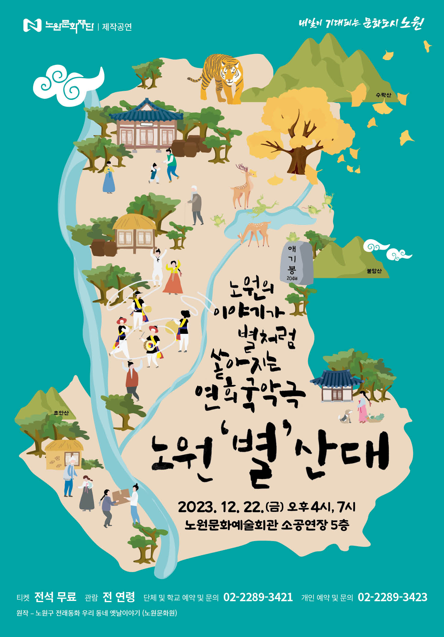 노원문화재단(이사장 강원재)은 노원의 전래 이야기를 산대놀이 형태로 풀어낸 연희국악극 ‘노원별산대’를 창제작하여 선보인다. 노원지역의 이야기를 공연 콘텐츠로 제작한 첫 기획으로 향후 지역사회를 위한 공연교육프로그램으로 공급할 예정이다.
