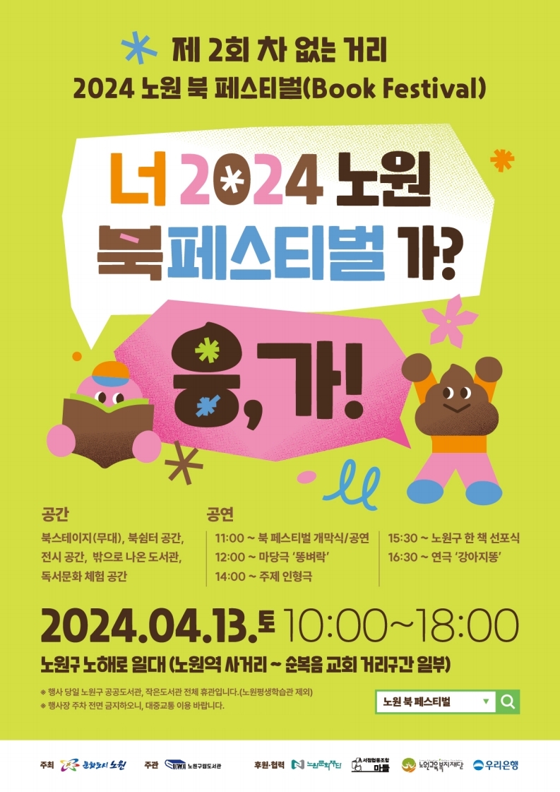 노원문화재단 노원구립도서관(이사장 강원재)이 오는 4월 13일 <2024 노원 북 페스티벌(Book Festival)> ‘너, 노원 북 페스티벌 가? 응,가!’를 개최한다.