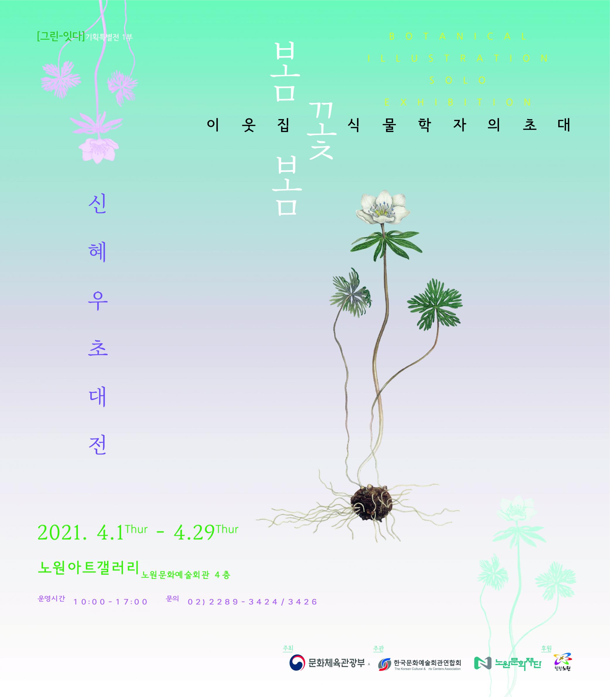 [나우온] [그린-잇다]기획특별전 “이웃집 식물학자의 초대, 봄꽃봄”노원문화재단(이사장 김승국)은 오는 4월 1일부터 4월 29일까지 노원문화예술회관 4층 노원아트갤러리에서 [그린-잇다]기획특별전 <이웃집 식물학자의 초대, 봄꽃봄>을 개최한다.이번 전시는 영국 왕립원예협회 보태니컬(Botanical) 아트쇼 3회 연속 금메달과 최고 전시상을 수상한 유일한 작가이자 미국 스미소니언 환경연구센터, 서대문자연사박물관 연구원을 지낸 식물분류학자, 신혜우 작가의 식물 세밀화 전시이다.전문: 나우온(http://www.nowonnews.net/20210323s6/)