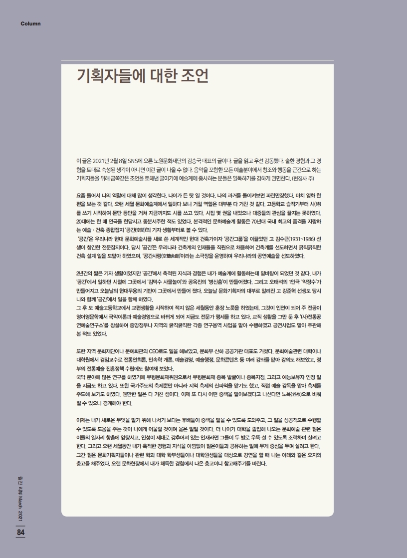 [문화일보] 김승국 노원문화재단 이사장 “노원 주민 위한 신규 문화예술 프로그램 적극 개발”서울 자치구 문화재단 최초로 뉴노멀 신사업 TF 구성“신종 코로나바이러스 감염증(코로나19) 사태 장기화로 문화생활 갈증을 느끼는 노원구 주민들을 위해 ‘뉴노멀 신사업 태스크포스(TF)를 구성하고 신규 문화예술 프로그램을 적극적으로 개발하려고 합니다”전문: 문화일보(http://www.munhwa.com/news/view.html?no=20210309MW103708286055)