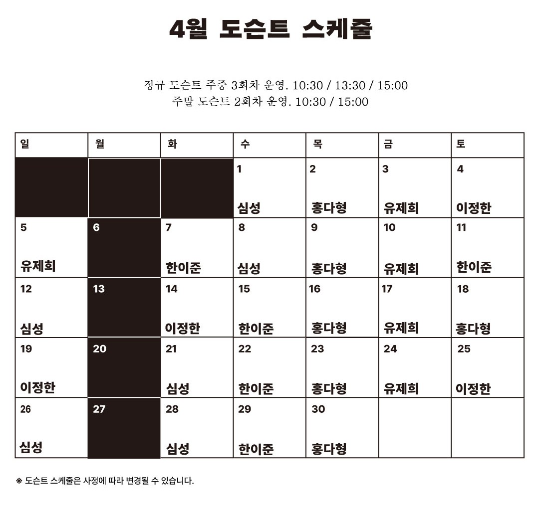 ※ 평일 3회, 주말 2회 운영 단 4/4(토), 4/18(토) 일정은 10시30분/13시 진행
