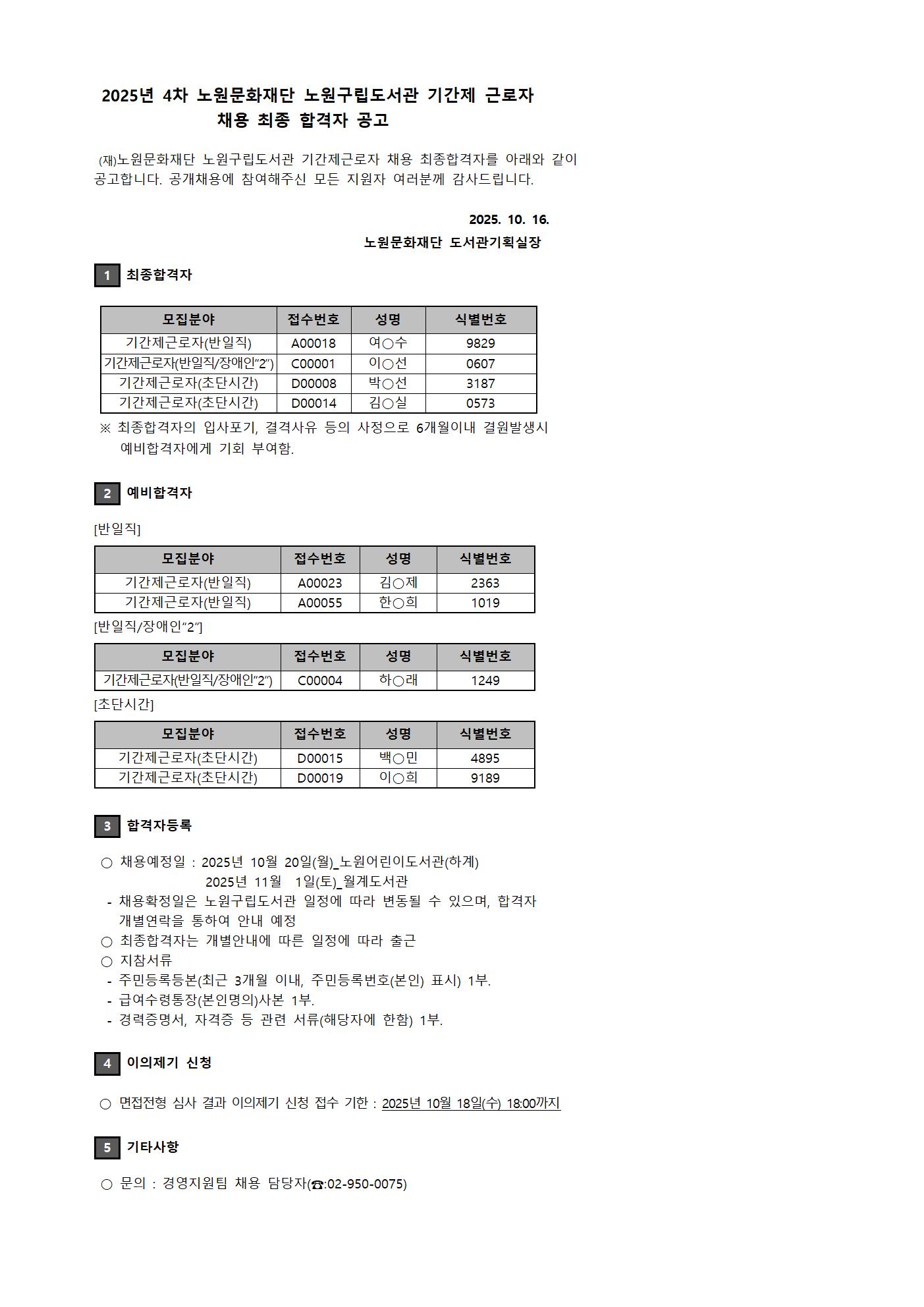 채용공고 2025년 4차 노원문화재단 노원구립도서관 기간제근로자 채용 최종 합격자 공고(노원어린이(하계), 월계도서관) 2025.10.16 251 현재 URL 복사 블로그 바로가기 첨부파일 #1: [붙임] 채용결과이의신청서.hwp 다음글 2025년 4차 노원문화재단 노원구립도서관 기간제근로자 서류전형 결과 및 면접전형 공고(하계, 노원어린이, 월계도서관) 목록