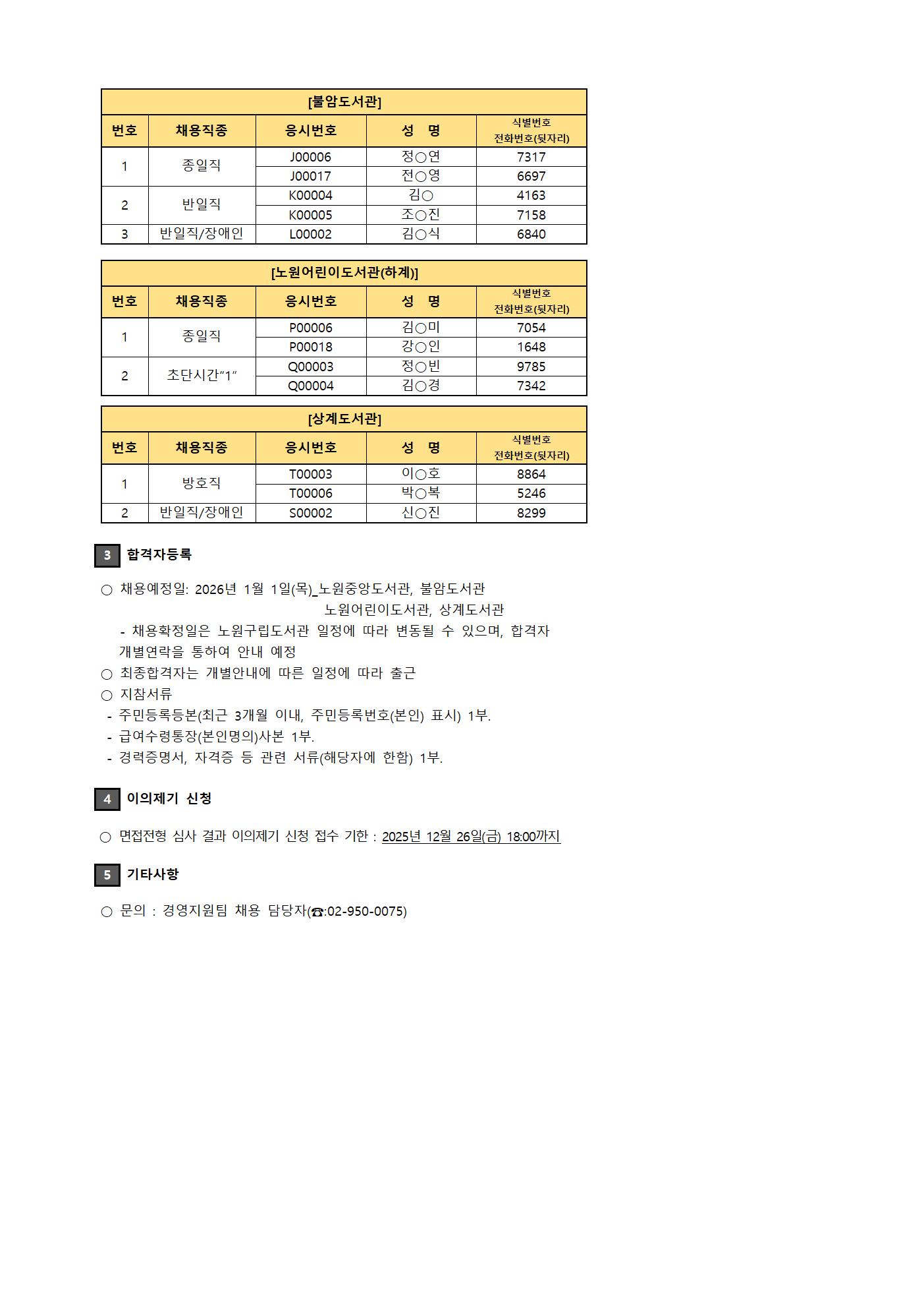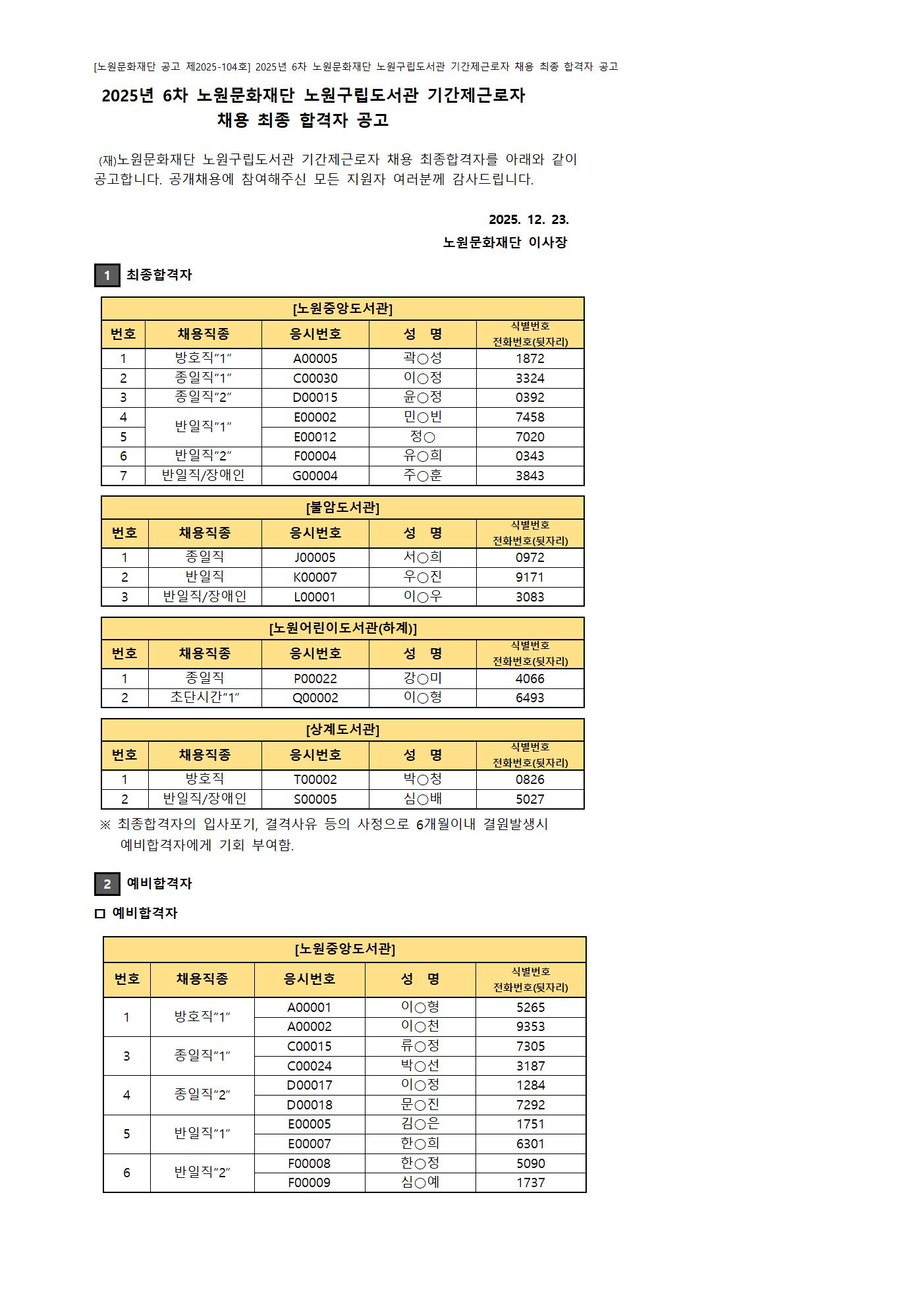 채용공고 2025년 6차 노원문화재단 노원구립도서관 기간제근로자 채용 최종 합격자 공고 2025.12.23 615 현재 URL 복사 블로그 바로가기 첨부파일 #1: [붙임 나] 채용결과이의신청서.hwp 다음글 2025년 5차 노원문화재단 노원구립도서관 채용 최종합격자공고[대체계약직-사서] 목록