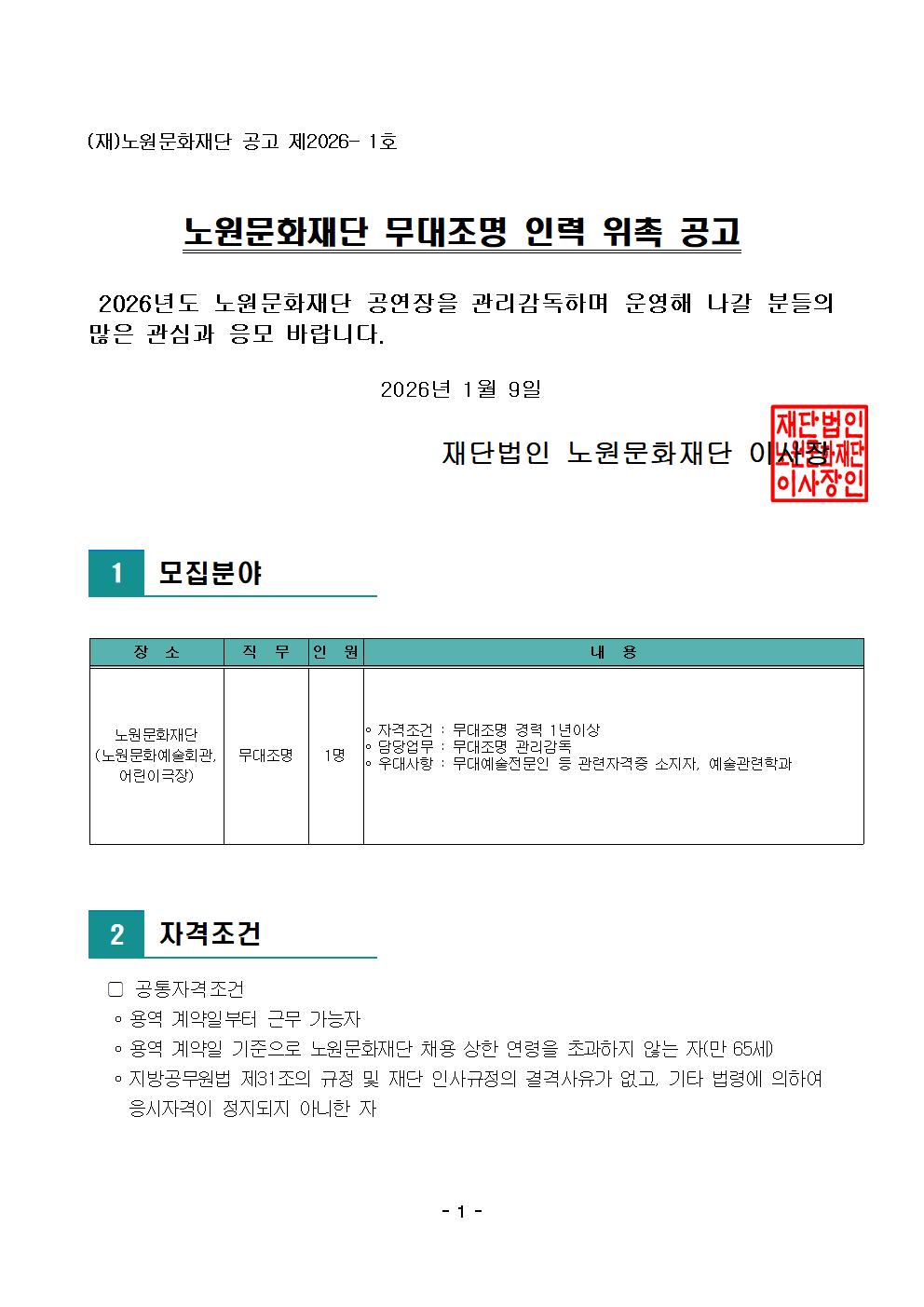 채용공고 2026년 노원문화재단 무대조명 인력 위촉 공고 2026.01.09 264 현재 URL 복사 블로그 바로가기 첨부파일 #1: (붙임2)개인정보활용동의서(양식).hwp 첨부파일 #2: (붙임1)이의제기 신청 안내 및 신청서.hwp 이전글 2026년 제1차 공개채용 공고 다음글 2025년 6차 노원문화재단 노원구립도서관 기간제근로자 채용 최종 합격자 공고 목록