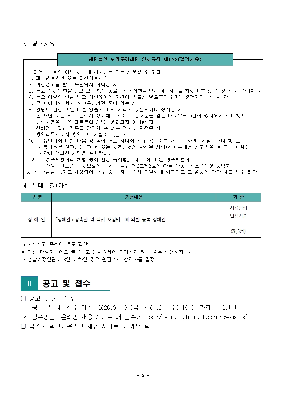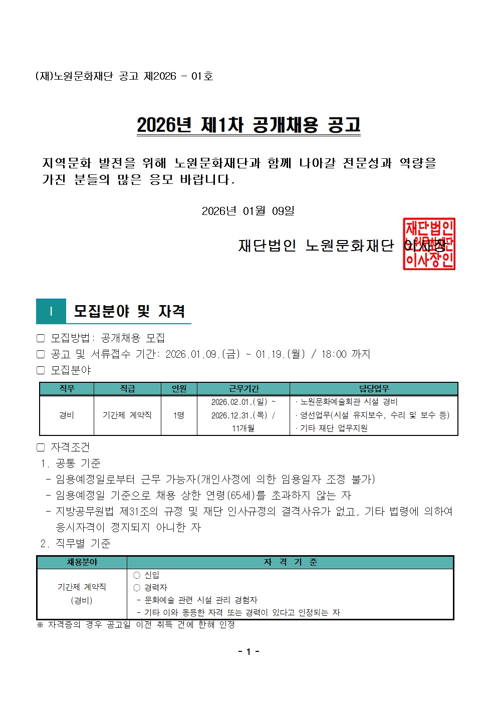 채용공고 2026년 제1차 공개채용 공고 2026.01.09 1,625 현재 URL 복사 블로그 바로가기 ○ 2026년 제1차 공개채용 바로가기 ○ 첨부파일 #1: 이의제기 신청 안내 및 신청서.hwp 이전글 2026년 제2차 공개채용 공고 다음글 2026년 노원문화재단 무대조명 인력 위촉 공고 목록