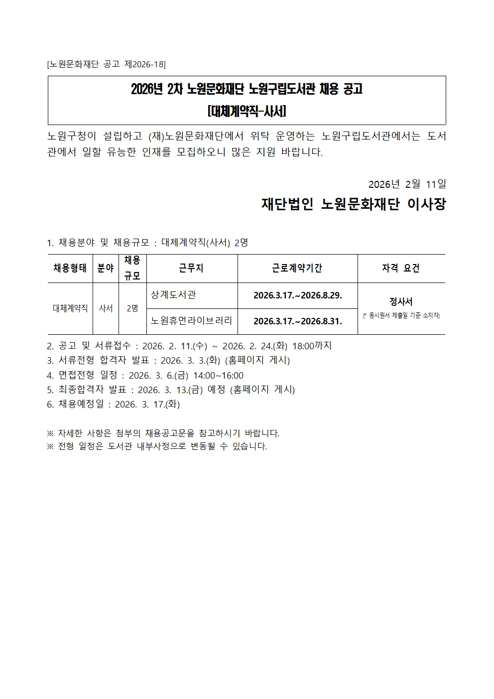 채용공고 2026년 2차 노원문화재단 노원구립도서관 채용 공고[대체계약직-사서] 2026.02.11 85 현재 URL 복사 블로그 바로가기 ☞온라인 채용 사이트 바로가기 첨부파일 #1: 채용결과 이의신청서.hwp 첨부파일 #2: [공고 제2026-18] 2026년 2차 노원문화재단 노원구립도서관 채용 공고[대체계약직-사서].pdf 이전글 2026 꿈의 무용단 노원 운영 코디네이터 모집 다음글 2026년 노원문화재단 무대조명 인력 채용공고 최종 합격자 및 향후일정 안내 목록